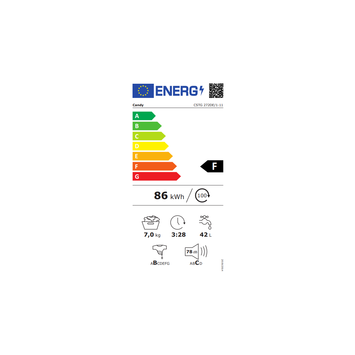Candy CSTG 272DE/1-11. Tipo di carica: Caricamento dall'alto. Capacità cestello: 7 kg, Classe di efficienza della centrifuga: C, Silenziosità (centrifuga): 78 dB, Silenziosità (lavaggio): 61 dB, Velocità di centrifuga massima: 1200 Giri/min. Classe efficienza energetica: F (A+++), Consumo energetico annuale: 175 kWh, Consumo annuale di acqua: 9300 L. Colore del prodotto: Bianco. Larghezza: 405 mm, Profondità: 600 mm, Altezza: 850 mm