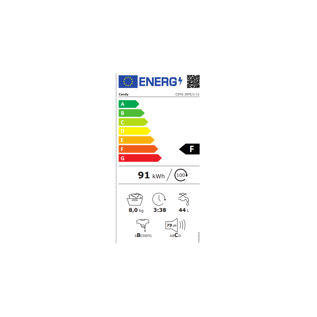 Candy CSTG 28TE/1-11. Tipo di carica: Caricamento dall'alto. Capacità cestello: 8 kg, Classe di efficienza della centrifuga: B, Silenziosità (centrifuga): 78 dB, Silenziosità (lavaggio): 61 dB, Velocità di centrifuga massima: 1200 Giri/min. Classe efficienza energetica: F (A+++), Consumo energetico annuale: 196 kWh, Consumo annuale di acqua: 9850 L. Colore del prodotto: Bianco. Larghezza: 405 mm, Profondità: 600 mm, Altezza: 850 mm