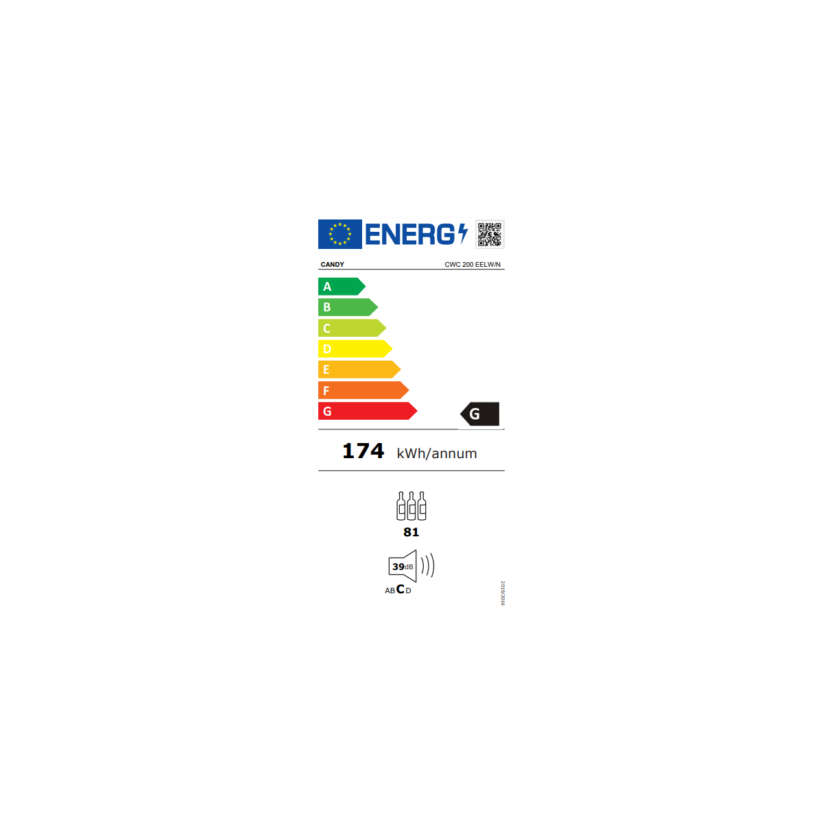 Candy DiVino CWC 200 EELW/N. Posizionamento dell'apparecchio: Libera installazione, Colore struttura: Nero, Colore interno: Nero. Capacità bottiglie: 81 bottiglia/bottiglie, Intervallo temperatura (zona 1): 7 - 18 °C, Classe emissione rumore: C. Classe efficienza energetica: G, Consumo energetico annuo: 174 kWh, Scala di efficienza energetica: Da A a G. Tipo di controllo: Pulsanti, Tipo di lampada: LED. Larghezza: 490 mm, Profondità: 550 mm, Altezza: 1460 mm