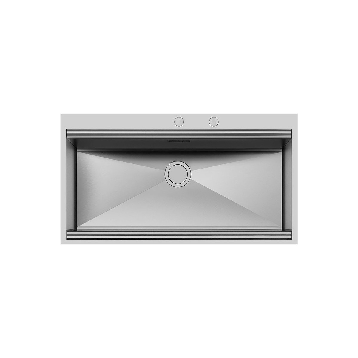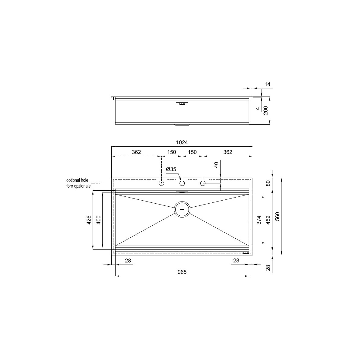 Lavello Milano Sopratop Materiale Finitura: Acciaio inox AISI 304 - finitura spazzolato Base: 120 cm Dimensioni: 1024x560 mm Bordo Installazione: Bordo Q4 - per incasso sopratop Numero Vasche: 1 vasca Misura Vasca: 968x400 mm mm Piletta: piletta con comando automatico SPACE MILANO - 3,5" Fori Mixer: 2 fori di serie Dotazioni standard: ganci di fissaggio, guarnizione, piletta, troppo-pieno e sifone, Imballo in scatola
