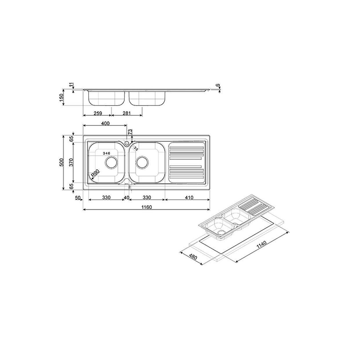 Smeg LYP116D - Lavello da Incasso, 2 Vasche, Gocciolatoio a Destra, Rettangolare, Acciaio