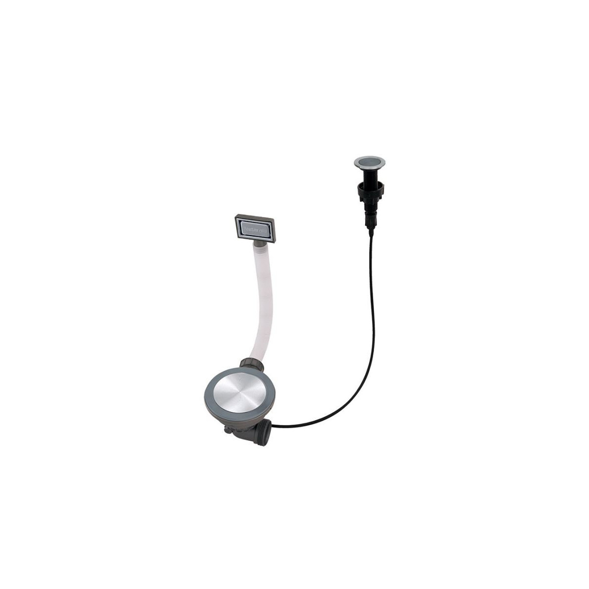 Piletta automatica Space Push Gun Metal con comando remoto rotondo a pressione e con troppopieno perimetrale. Doppio tappo in dotazione: Space gun metal e "a cestello" Gun Metal.