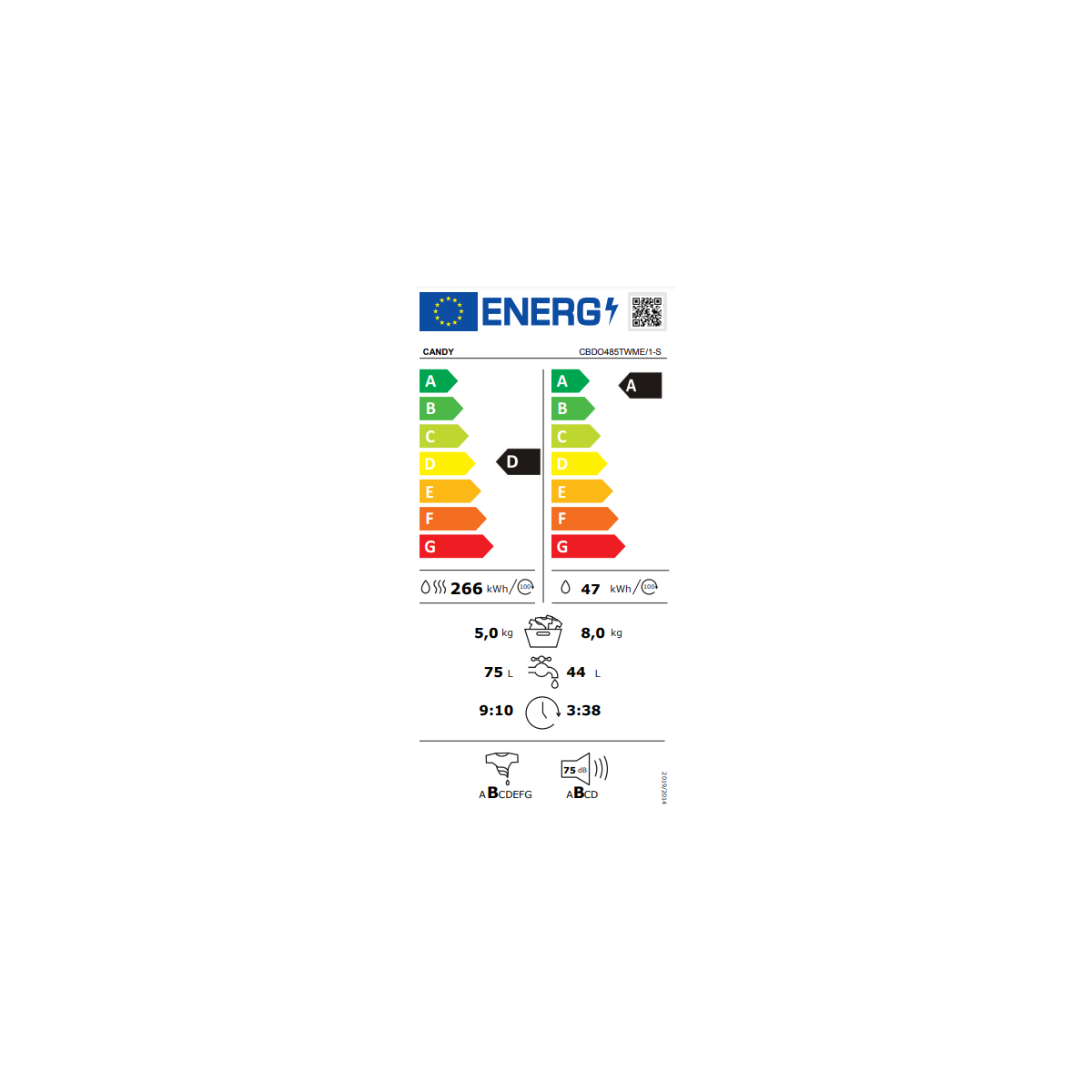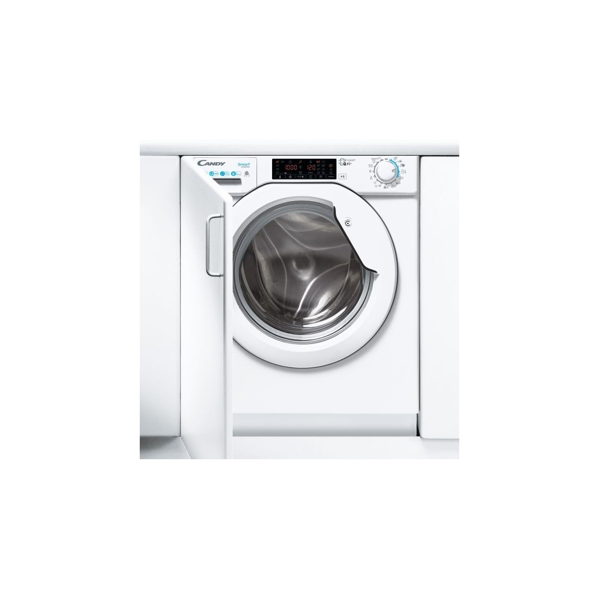 Candy CBDO485TWME/1-S. Tipo di carica: Caricamento frontale, Posizionamento dell'apparecchio: Da incasso, Colore del prodotto: Bianco. Capacità di asciugatura: 5 kg, Velocità di centrifuga massima: 1400 Giri/min, Classe efficacia di lavaggio: A. Classe efficienza energetica: D (A), Consumo di energia per lavaggio: 1,2 kWh, Consumo di energia (lavaggio e asciugatura): 5,44 kWh. Larghezza: 600 mm, Profondità: 525 mm, Altezza: 875 mm