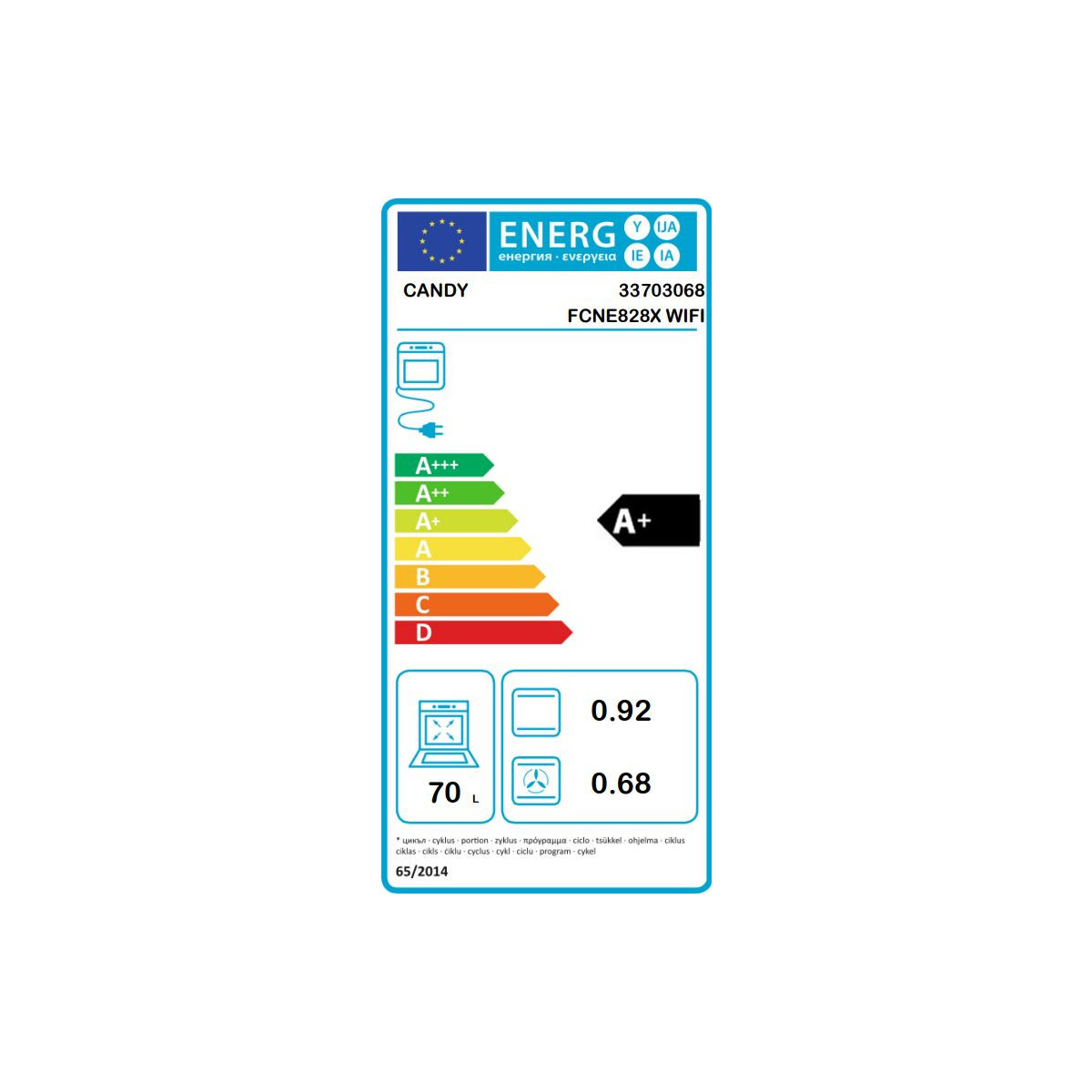 Candy FCNE828X. Dimensione del forno: Media, Tipo di forno: Forno elettrico, Capacità interna forno totale: 70 L. Colore del prodotto: Acciaio inossidabile, Tipo di controllo: Touch, Posizione di controllo: Frontale. Classe efficienza energetica: A+, Consumo di energia (standby): 0,1 kWh. Larghezza: 595 mm, Profondità: 595 mm, Altezza: 568 mm