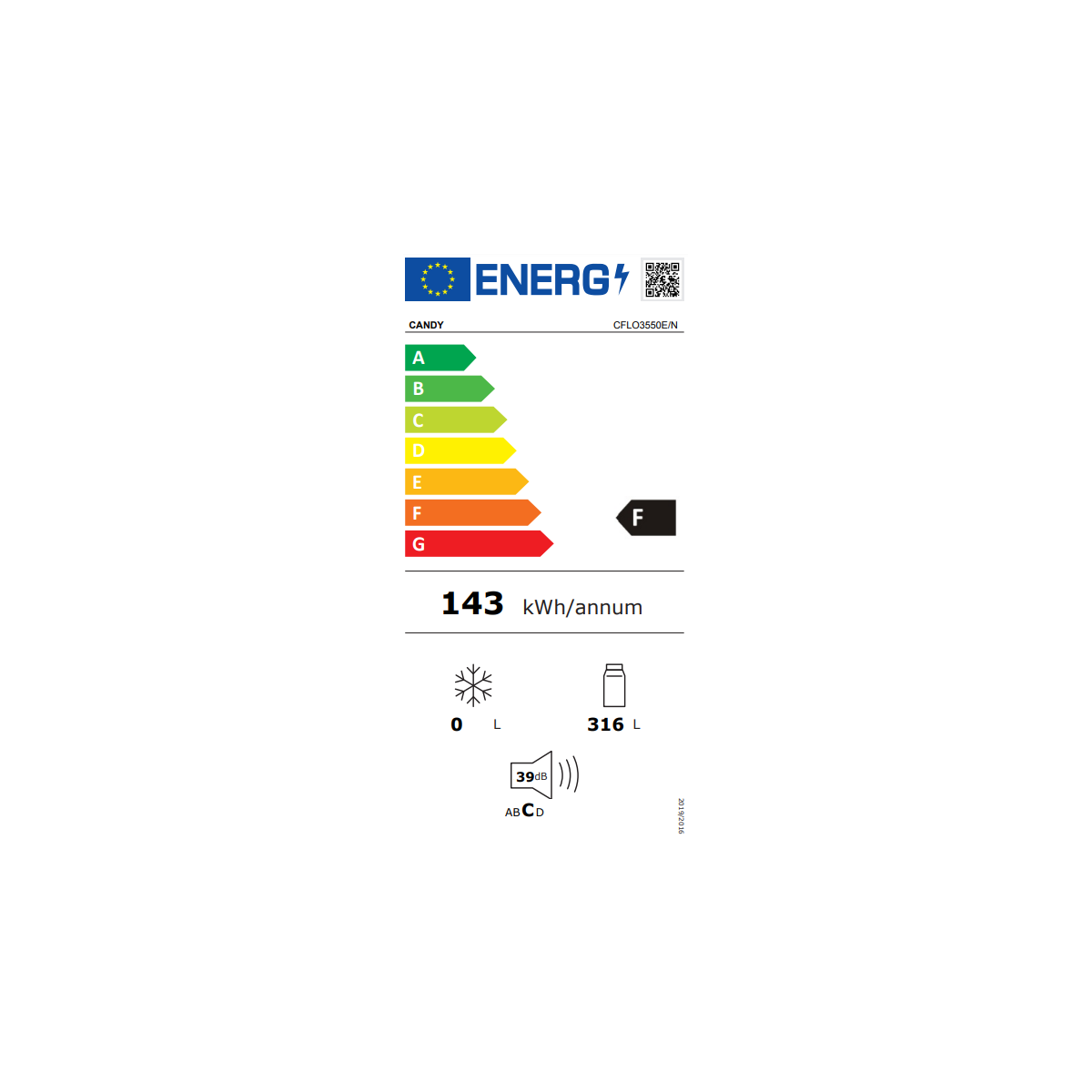 Candy CFLO3550E/N. Capacità netta frigorifero: 316 L, Classe climatica: N-ST, Emissione acustica: 39 dB. Numero di ripiani frigorifero: 6, Numero di cassetti per verdura: 1. Tipo di lampada: LED. Cerniera porta: Destra. Consumo energetico annuo: 143 kWh. Peso: 58 kg. Colore del prodotto: Bianco