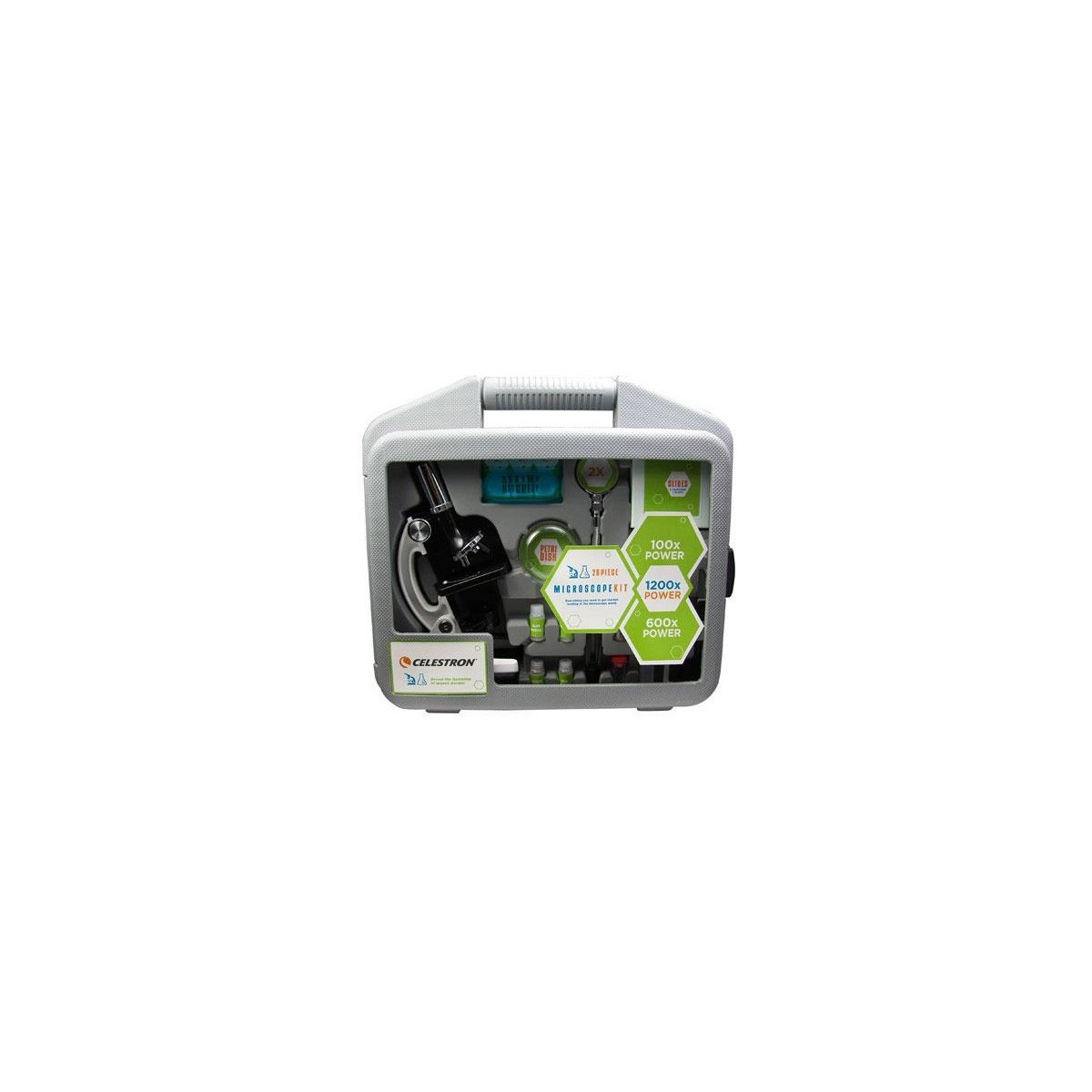 Kit entry-level per microscopia composto da 28 pezzi in valigetta. Microscopio biologico entry level completo di kit per l’osservazione e la preparazione dei vetrini. Corpo in metallo, torretta con 3 obiettivi ingrandimenti 100x, 600x, 1200x, vetrini pronti, vetrini vuoti, coprivetrini, accessori, robusta valigetta in ABS, illuminazione a specchio regolabile o illuminatore a batterie (non incluse).
