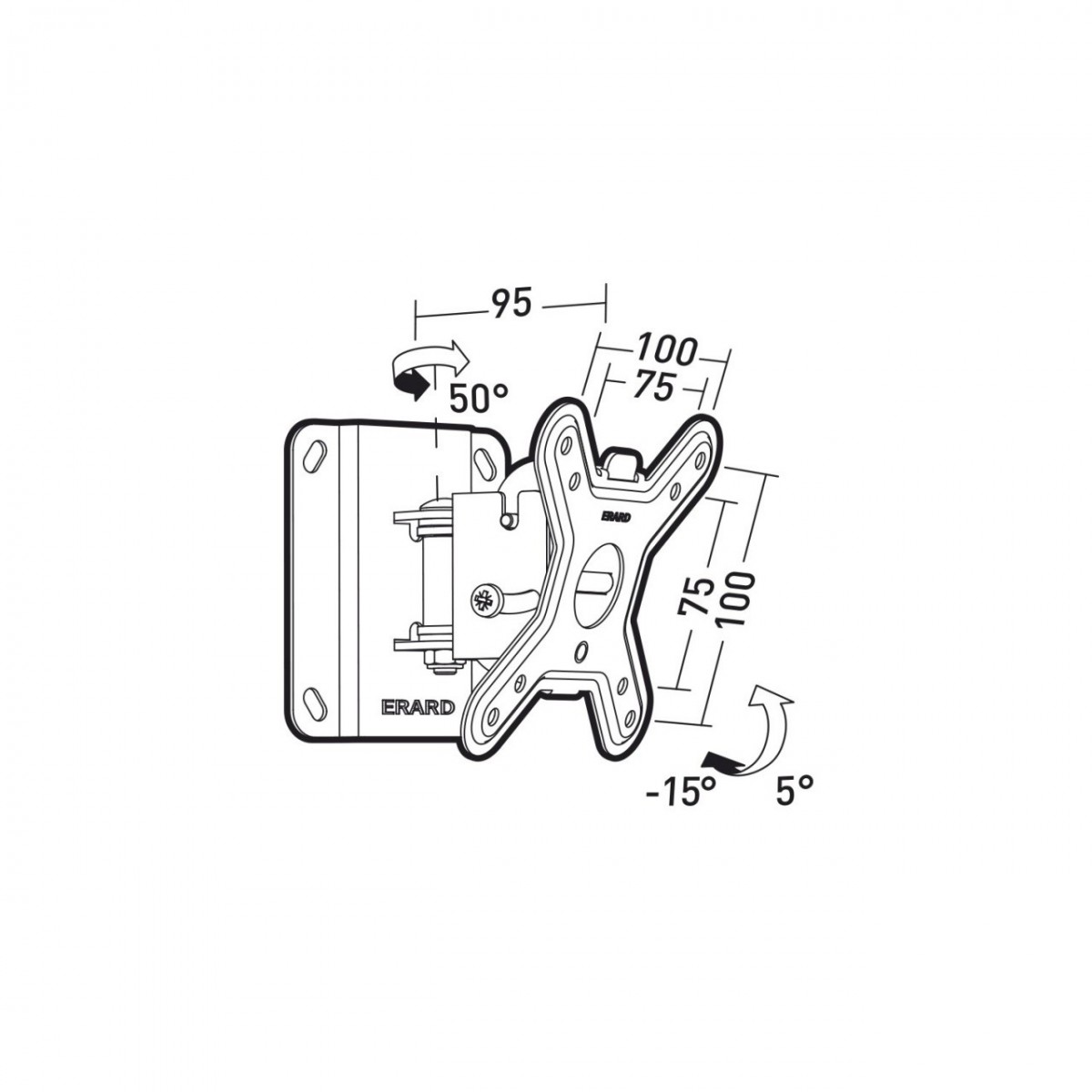 Erard CLIFF 100TW45. Peso massimo (capacità): 15 kg, Capienza minima dimensioni dello schermo: 38,1 cm (15"), Capienza massima dimensioni dello schermo: 58,4 cm (23"), Compatibilità interfaccia di montaggio (min): 75 x 75 mm, Compatibilità interfaccia di montaggio (max): 100 x 100 mm. Inclinazione: -15 - 5°, Angolo di rotazione: 0 - 25°. Colore del prodotto: Nero