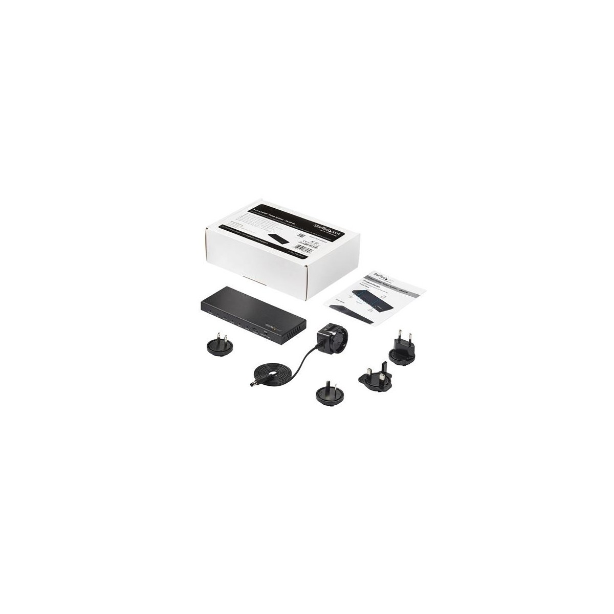 StarTech.com Sdoppiatore Splitter HDMI a 4 porte - 60Hz. Tipo porta video: HDMI, Uscita video: 4x HDMI. Risoluzione massima: 3840 x 2160 Pixel, Colore del prodotto: Nero, Tipologia HD: 4K Ultra HD. Voltaggio di ingresso: 100 - 240 V, Corrente d'ingresso: 1 A, Voltaggio di uscita: 5 V. Larghezza: 64 mm, Profondità: 165 mm, Altezza: 65 mm. Larghezza imballo: 148 mm, Profondità imballo: 212 mm, Altezza imballo: 55 mm