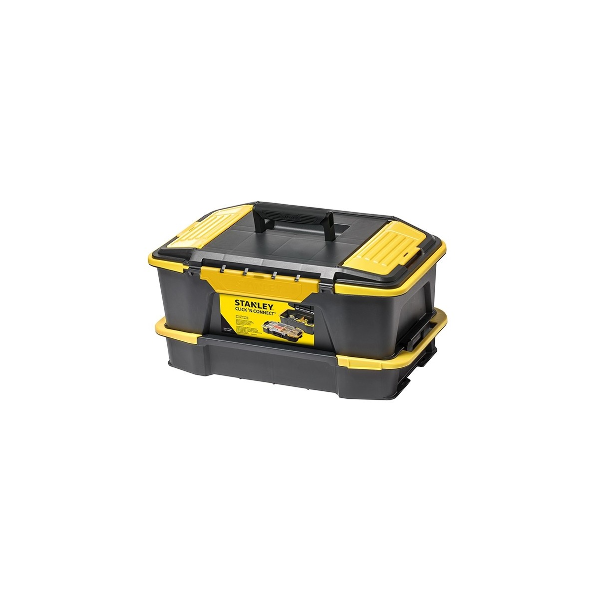 Piattaforma "Click & Connect" STANLEY. Cerniere di chiusura removibili: permettono l'aggancio e sgancio dalla parte inferiore per ottenere una completa visibilita' ed accessibilita' al contenuto. Organizer con separatori removibili: consentono grande personalizzazione dello spazio interno. Cassetta con organizer nel coperchio per contenere piccoli accessori, punte e inserti. Dimensioni cm.50,5x31x24,5. STST1-71962.