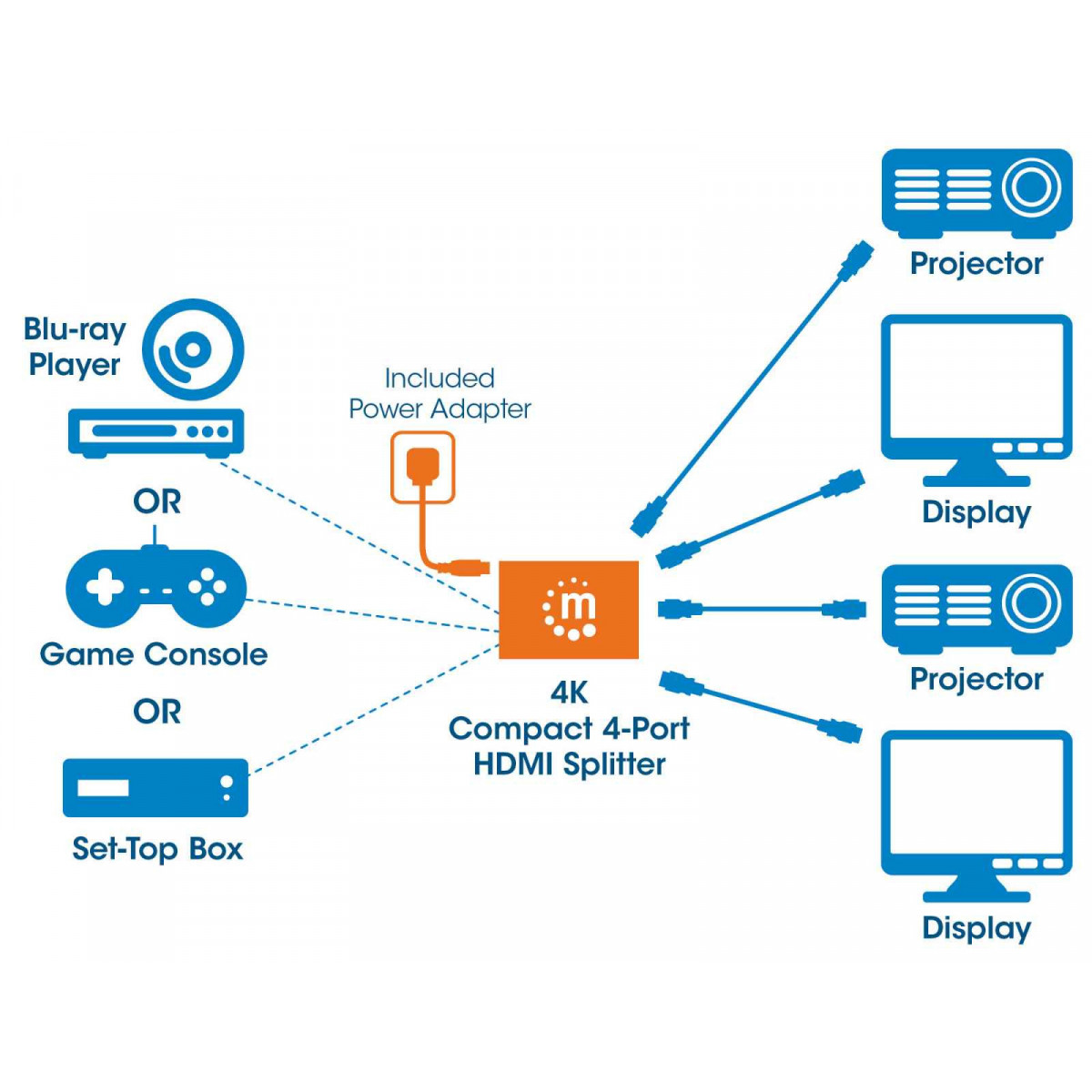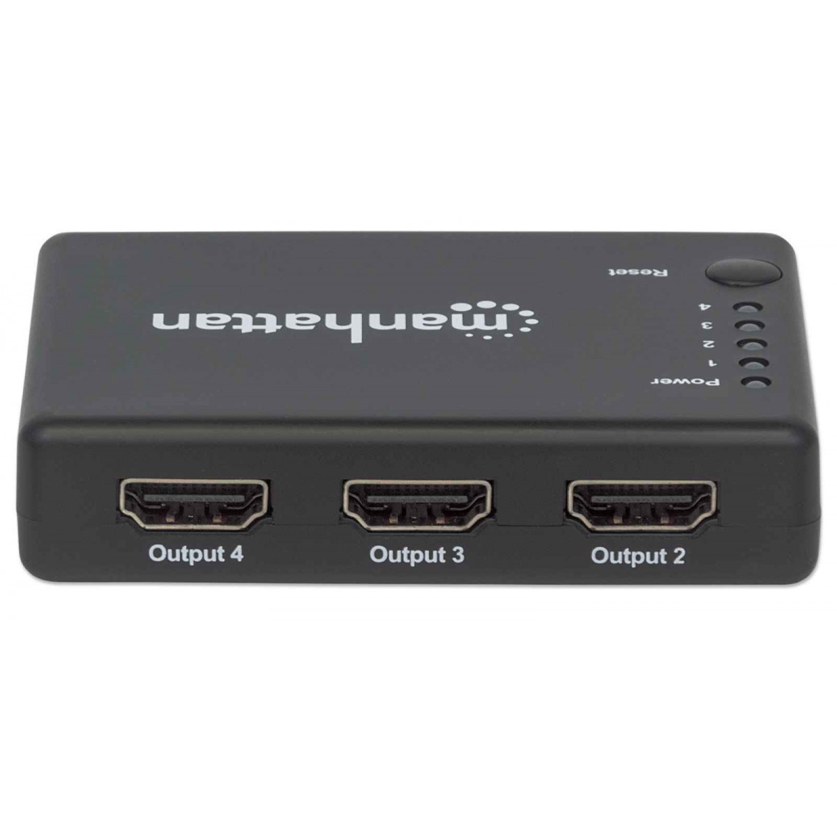 Manhattan 207706. Tipo porta video: HDMI, Uscita video: 4x HDMI. Risoluzione massima: 4096 x 2160 Pixel, Colore del prodotto: Nero, Materiale della scocca: Plastica. Voltaggio di uscita: 5 V, Corrente d'uscita: 1 A, Consumi: 5 W. Larghezza: 58 mm, Profondità: 81 mm, Altezza: 18 mm