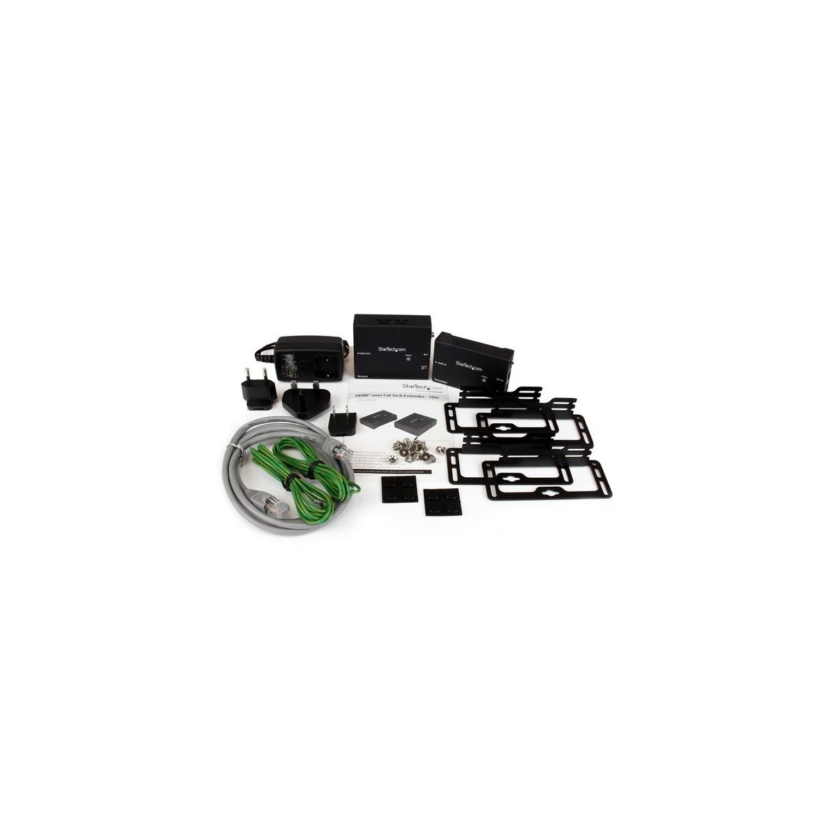 StarTech.com Juego Kit Extensor HDMI por Cable Ethernet UTP Cat5 Cat6 RJ45 Adaptador POC Power over Cable. Tipo: Trasmettitore e ricevitore AV, Risoluzione massima: 4096 x 2160 Pixel, Tipi di cavi supportati: Cat5e,Cat6. Tecnologia di connessione: Cablato. Tensione di ingresso AC: 110-240 V, Tensione di esercizio: 12 V, Corrente d'ingresso: 0.5 A. Larghezza: 67 mm, Profondità: 80 mm, Altezza: 25 mm. Larghezza imballo: 235 mm, Profondità imballo: 156 mm, Altezza imballo: 65 mm