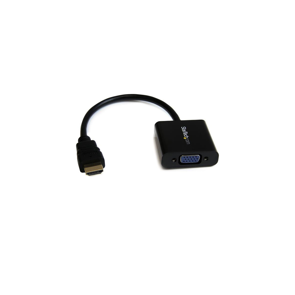 StarTech.com Adattatore HDMI a VGA - Convertitore HDMI a VGA per Portatili desktop/laptop/ultrabook - 1920 x 1080. Risoluzione massima video: 1920 x 1080 Pixel, Modalità video supportate: 1080p, Tempo massimo di refresh: 60 Hz. Tipo di convertitore: Convertitore video attivo, Risoluzione massima: 1920 x 1080 Pixel, Colore del prodotto: Nero. Interfaccia host: HDMI, interfaccia output: VGA. Larghezza: 40 mm, Profondità: 245 mm, Altezza: 15 mm. Larghezza imballo: 200 mm, Profondità imballo: 220 mm, Altezza imballo: 15 mm