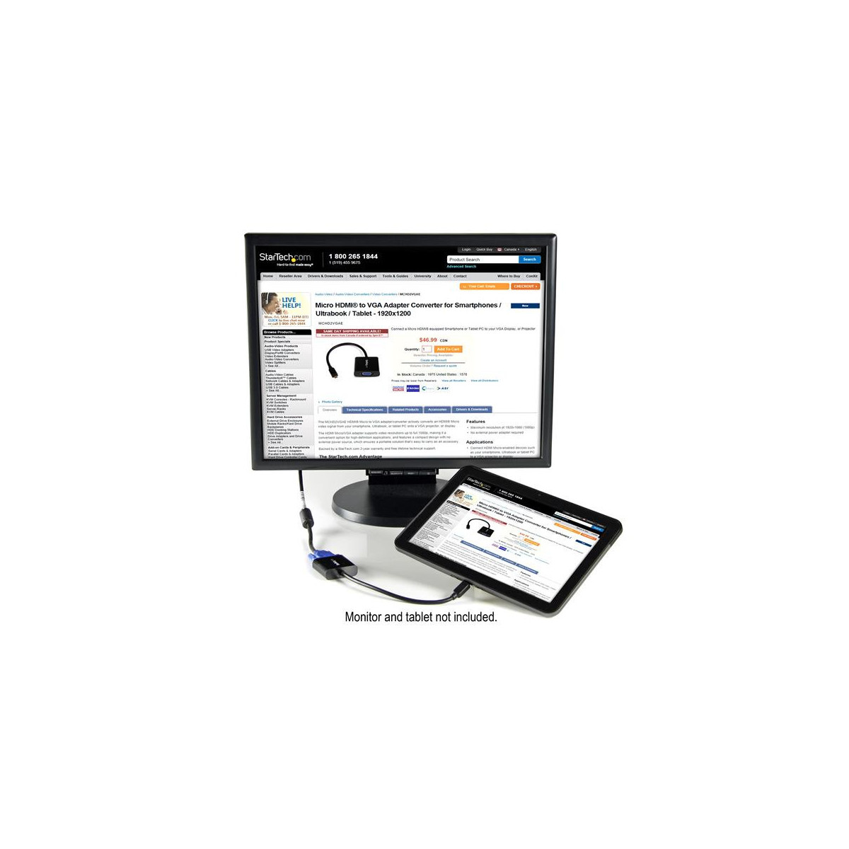 StarTech.com Adattatore convertitore Micro HDMI a VGA per smartphone/ultrabook/tablet - 1920x1080. Risoluzione massima video: 1920 x 1200 Pixel, Risoluzioni video: 1600 x 1200,1920 x 1080,1920 x 1200, Tempo massimo di refresh: 60 Hz. Tipo di convertitore: Convertitore video attivo, Risoluzione massima: 1920 x 1200 Pixel, Colore del prodotto: Nero. Interfaccia host: Micro-HDMI, interfaccia output: VGA. Larghezza: 45 mm, Profondità: 255 mm, Altezza: 15 mm. Larghezza imballo: 45 mm, Profondità imballo: 255 mm, Altezza imballo: 15 mm