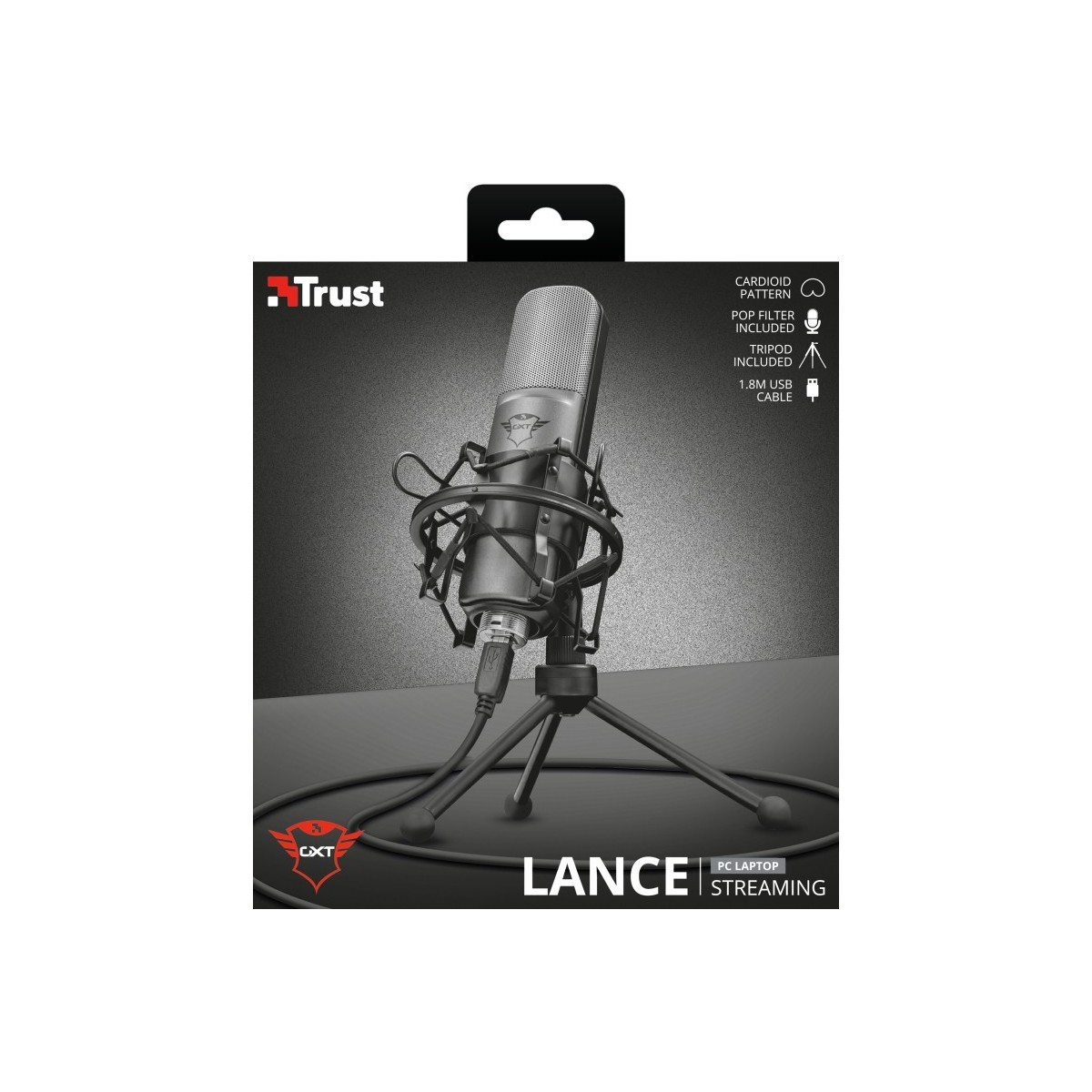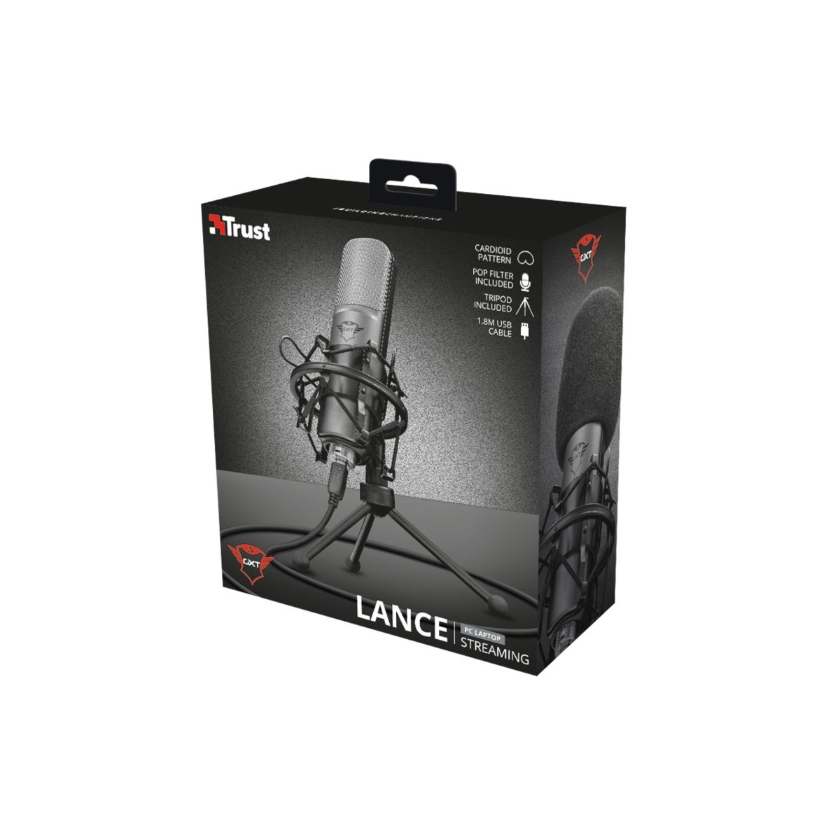 Trust GXT 242. Tipo: Microfono da tavolo, Sensibilità microfono: -45 dB, Frequenza microfono: 20 - 20000 Hz. Tecnologia di connessione: Cablato, Interfaccia dispositivo: USB. Colore del prodotto: Nero, Lunghezza cavo: 1,8 m. Rapporto segnale/rumore (SNR): 70 dB. Peso microfono: 573 g