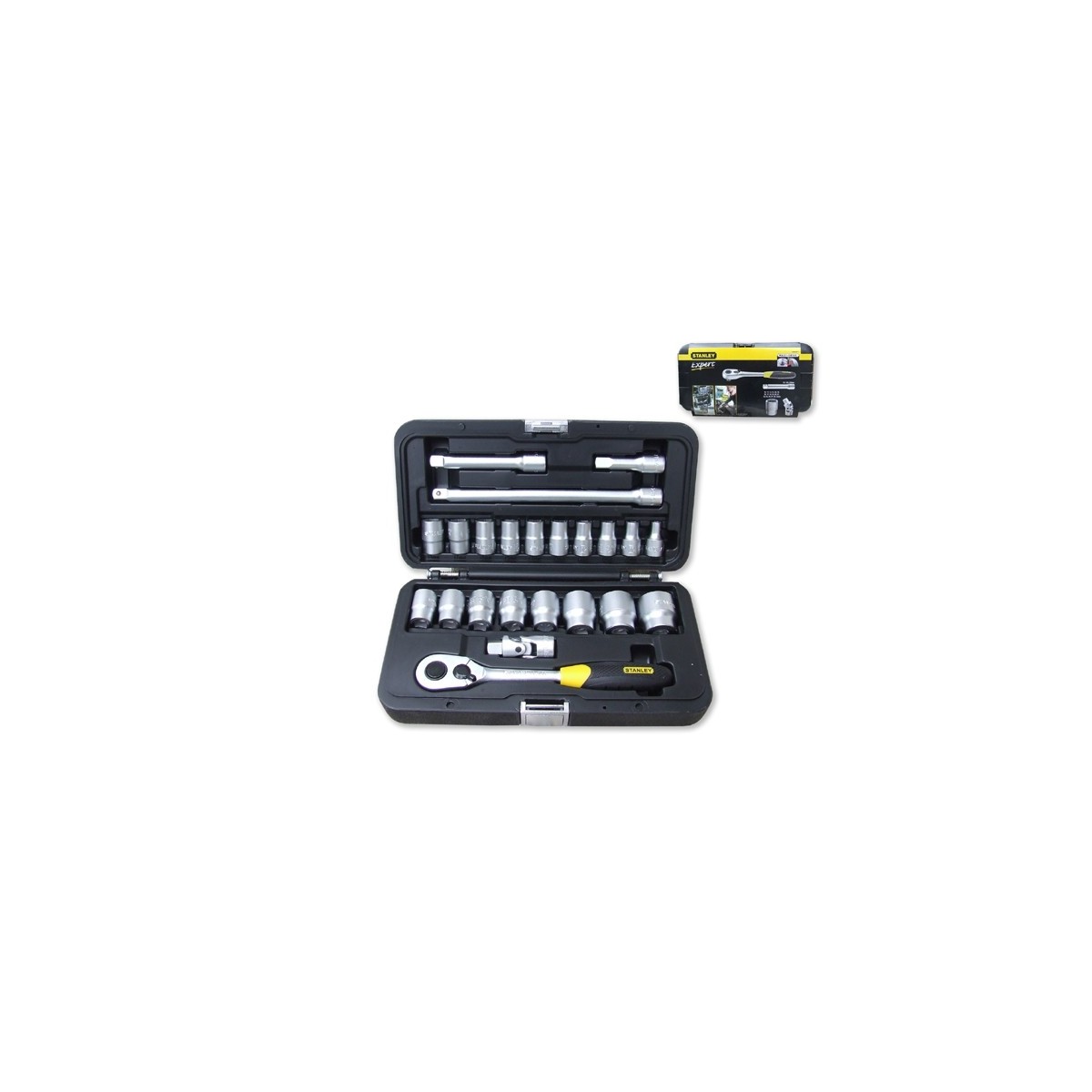 Chiavi STANLEY a bussola in acciaio al cromo vanadio in valigetta da 23 pezzi. Attacco da 1/2". 1 cricchetto, 3 prolunghe ( 75, 125, 250 mm.), 1 snodo universale, 18 bussole esagonali ( 10, 11, 12, 13, 14, 15, 16, 17, 18, 19, 20, 21, 22, 23, 24, 27, 30, 32 mm.) Valigetta in materiale sintetico con chiusura in metallo, adattabile all'interno dei cassetti dei carrelli.