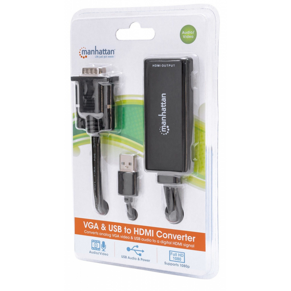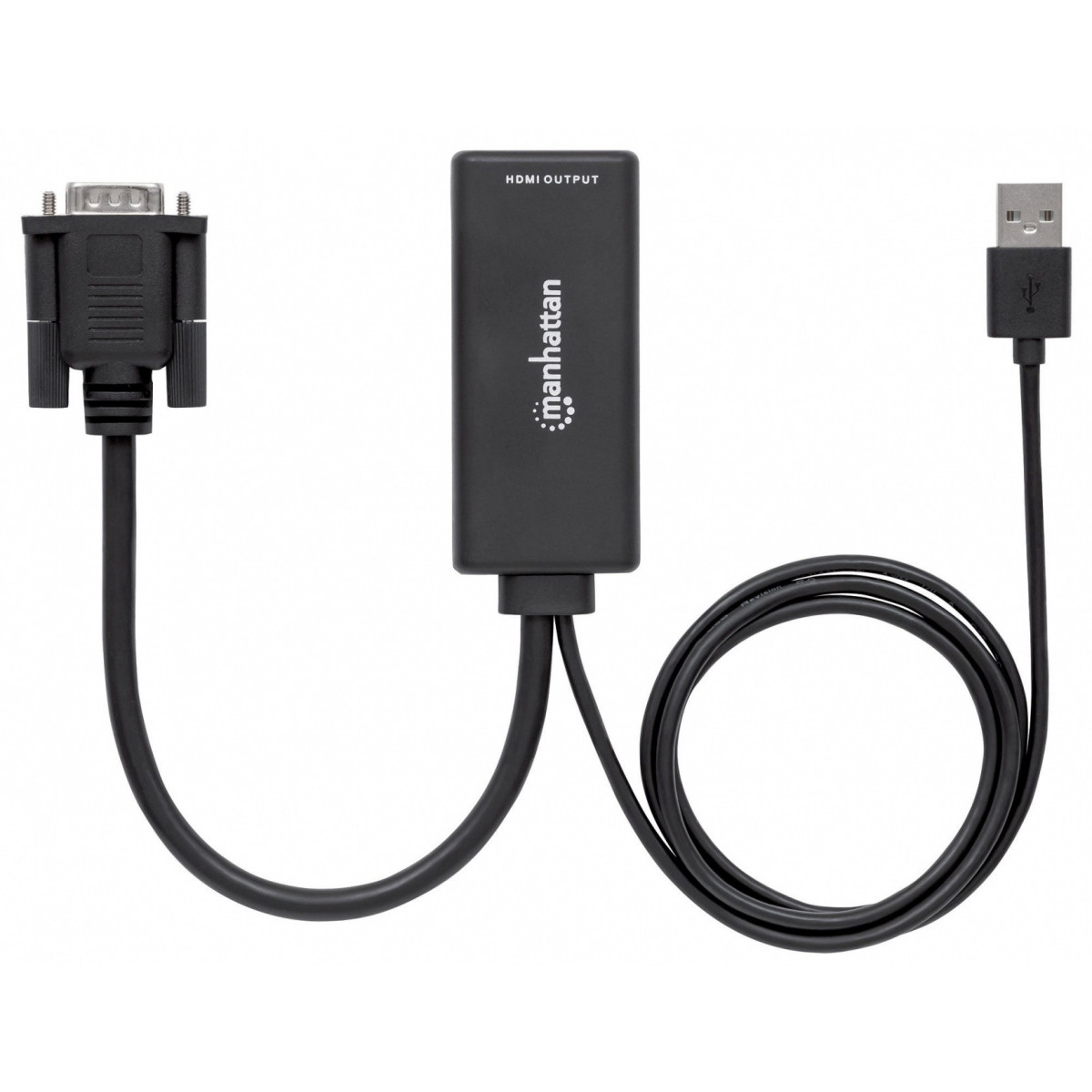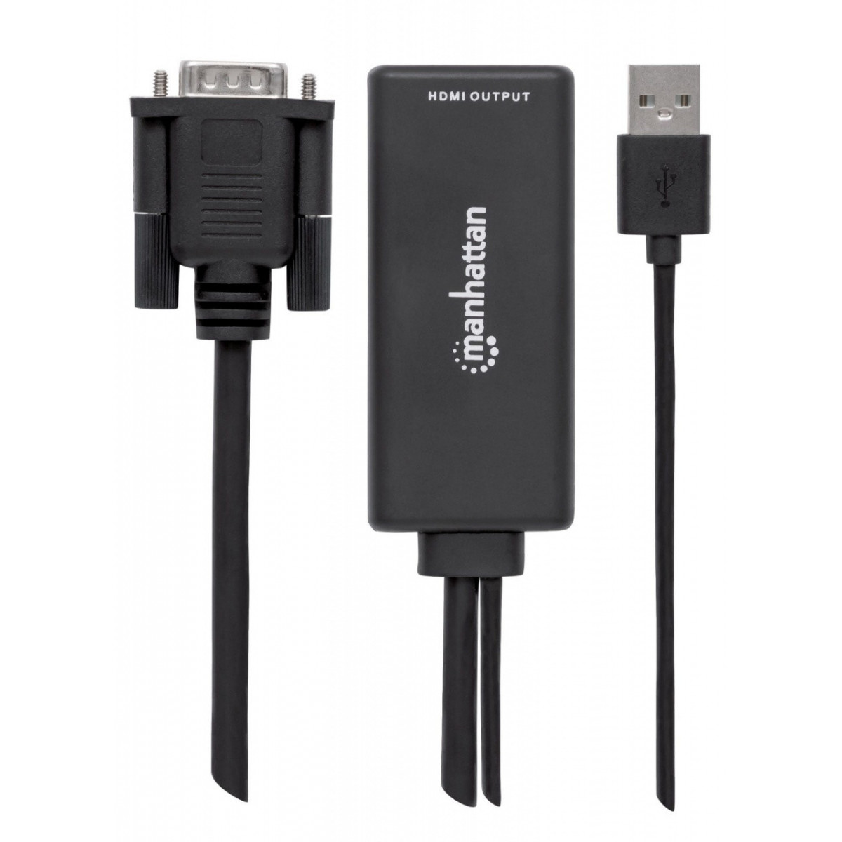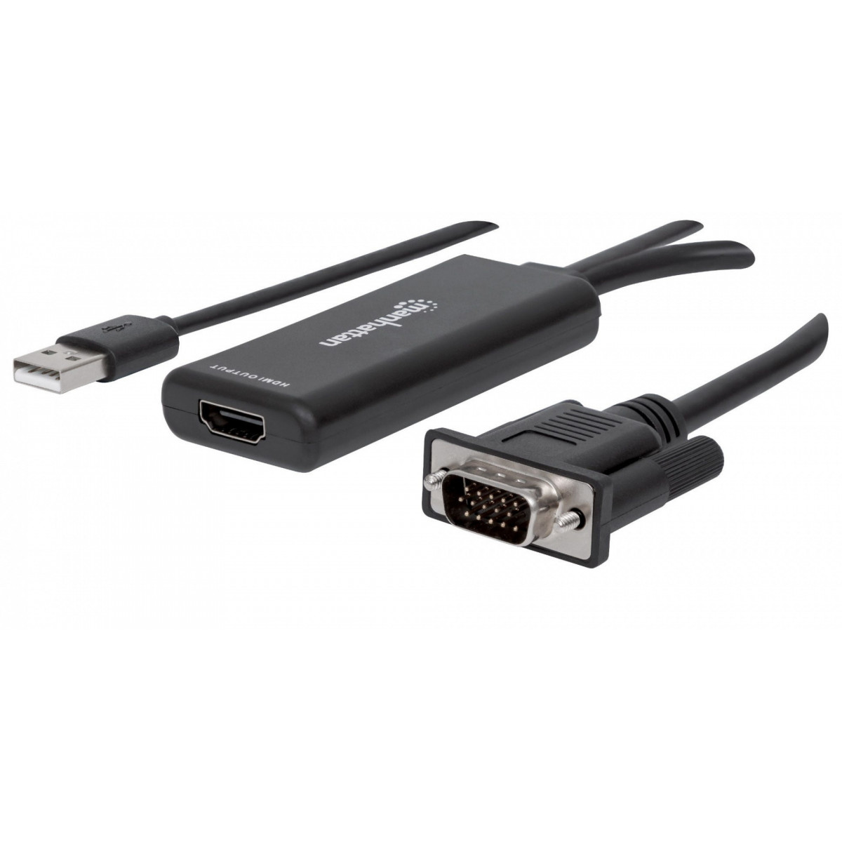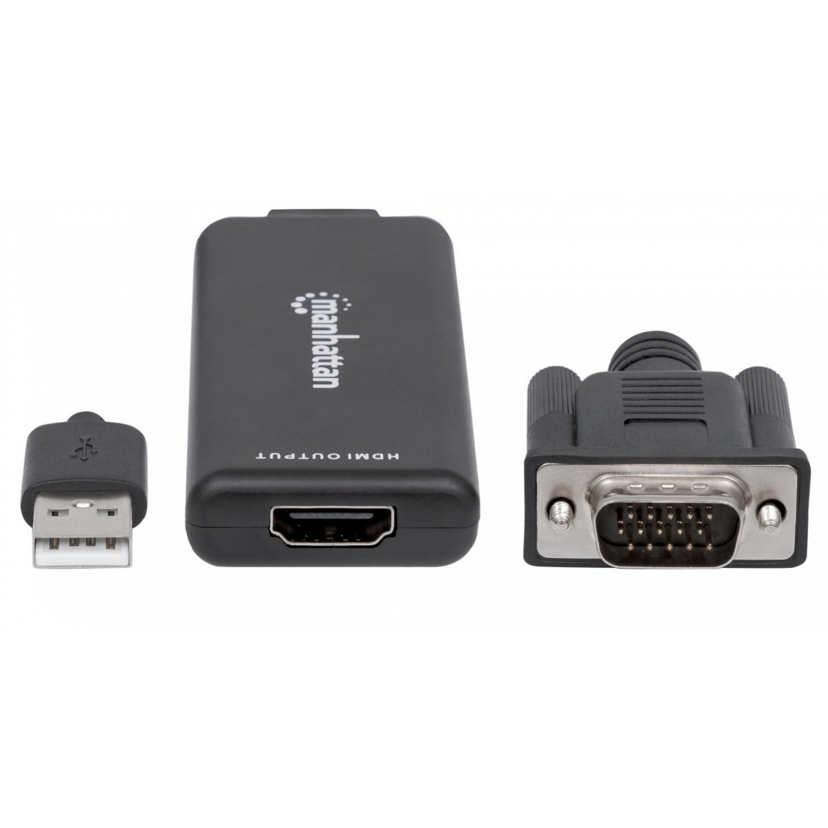 Manhattan 152426. Risoluzione massima video: 1920 x 1200 Pixel, Modalità video supportate: 480i,480p,576i,576p,720p,1080i,1080p, Ampiezza banda: 1,65 Gbit/s. Colore del prodotto: Nero, Materiale della scocca: Plastica, Certificazione: HDMI CE FCC. Interfaccia host: VGA (D-Sub) + USB, interfaccia output: HDMI. Tensione di esercizio: 5 V, Corrente operativa: 1 A. Larghezza: 89 mm, Profondità: 68 mm, Altezza: 29 mm