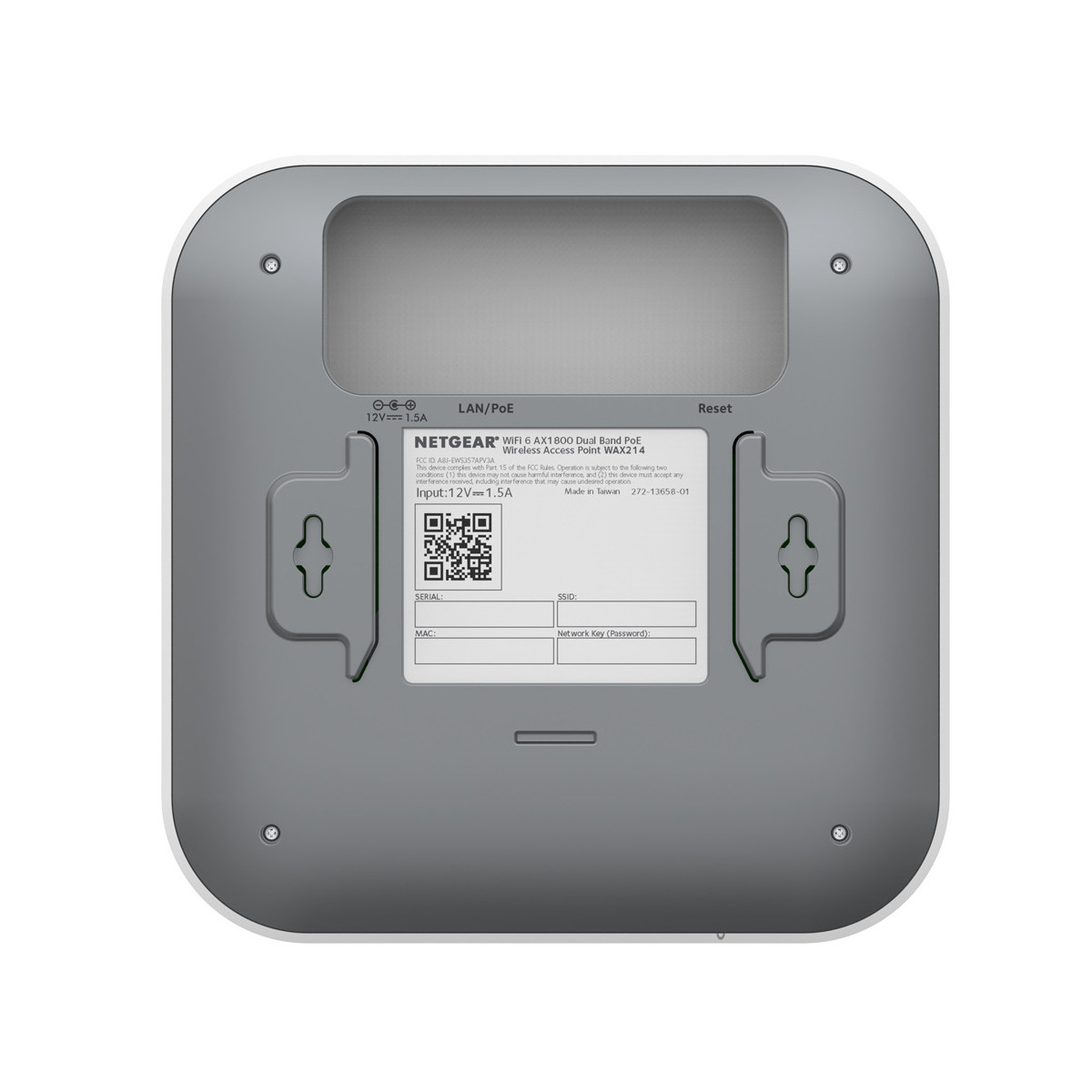 Netgear WAX214. Velocità massima di trasferimento dati: 1773,5 Mbit/s, Velocità massima di trasferimento dati (2,4 GHz): 573,5 Mbit/s, Velocità massima di trasferimento dati (5 GHz): 1201 Mbit/s. Algoritmi di sicurezza supportati: WPA2,WPA3. Voltaggio di ingresso: 12 V, Corrente d'ingresso: 1.5 A, Alimentazione: 18 W. Installazione: Soffitto, Tavolo, Parete, Colore del prodotto: Bianco, Tipologia slot blocco cavo: Kensington. Tipo di antenna: Interno, Livello di guadagno dell'antenna (max): 4 dBi