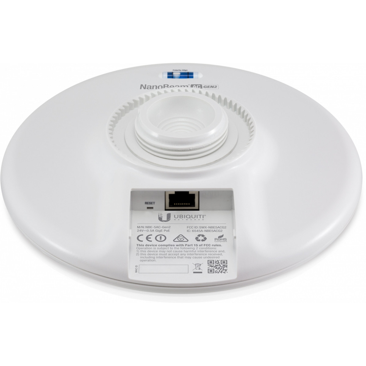 Ubiquiti Networks NanoBeam 5AC Gen 2. Velocità massima di trasferimento dati: 450 Mbit/s. Livello di guadagno dell'antenna (max): 19 dBi. Banda di frequenza: 2.412 - 2.472, 5.15 - 5.875; 5.15 - 5.25; 5.25 - 5.35; 5.47 - 5.725; 5.725 - 5.85 GHz, Modulazione: 16-QAM,64-QAM,256-QAM,BPSK,QPSK. Algoritmi di sicurezza supportati: WPA2. Tipo di prodotto: Bridge di rete, Colore del prodotto: Bianco, Indicatori LED: LAN, Potenza, Forza del segnale