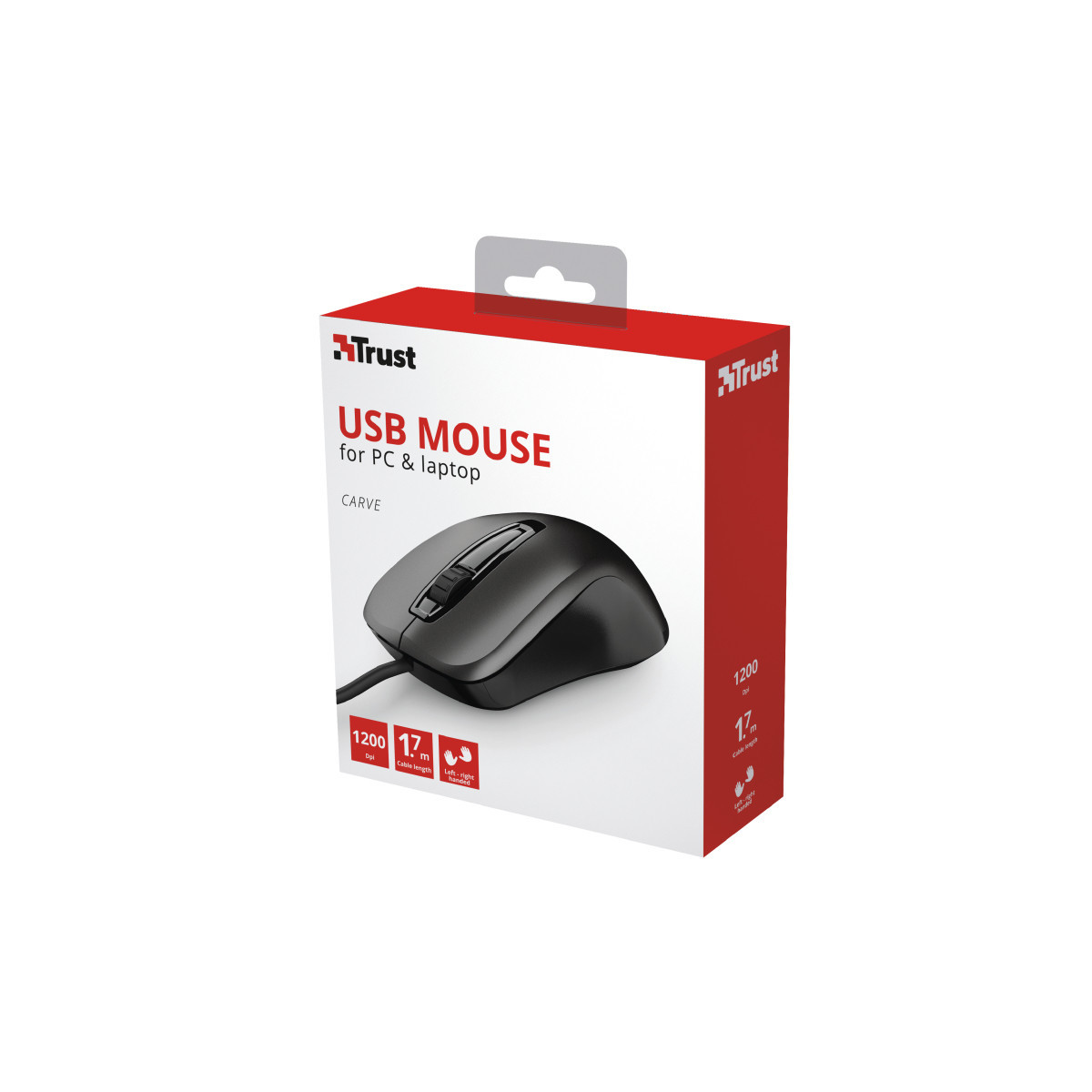 Trust Carve. Fattore di forma: Ambidestro. Tecnologia di rilevamento del movimento: Ottico, Interfaccia dispositivo: USB tipo A, Risoluzione movimento: 1200 DPI, Tipo di pulsanti: Tasti premuti, Numero di tasti: 3, Tipo di scorimmento: Rotella. Alimentazione: Cavo. Colore del prodotto: Nero