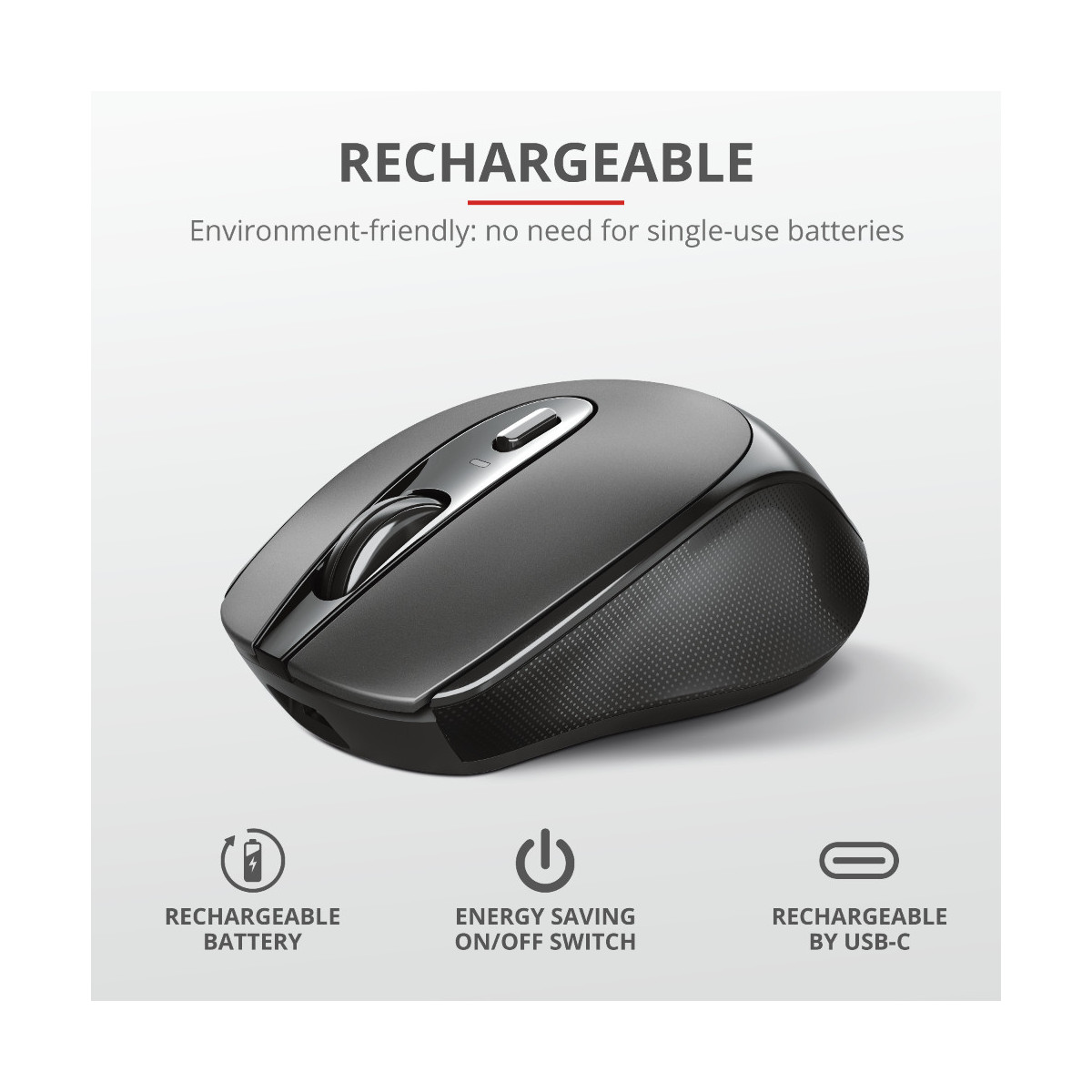 Il mouse wireless Zaya ha una batteria ricaricabile integrata, quindi non avrai bisogno di comprare altre batterie. Per la ricarica puoi usare il cavo USB-C in dotazione. Non soltanto risparmierai, ma rispetterai anche l'ambiente!