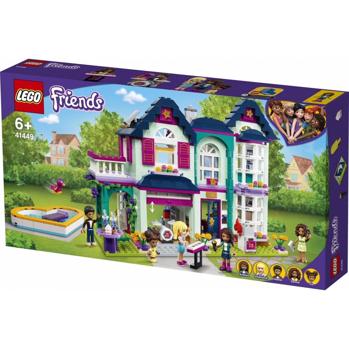 LEGO Friends La villetta familiare di Andrea - 41449. Tipo di prodotto: Set da costruzione, Genere consigliato: Ragazzo/Ragazza, Età consigliata (min): 6 anno/i, Numero di pezzi: 802 pezzo(i). Peso dell'imballo: 1,42 kg