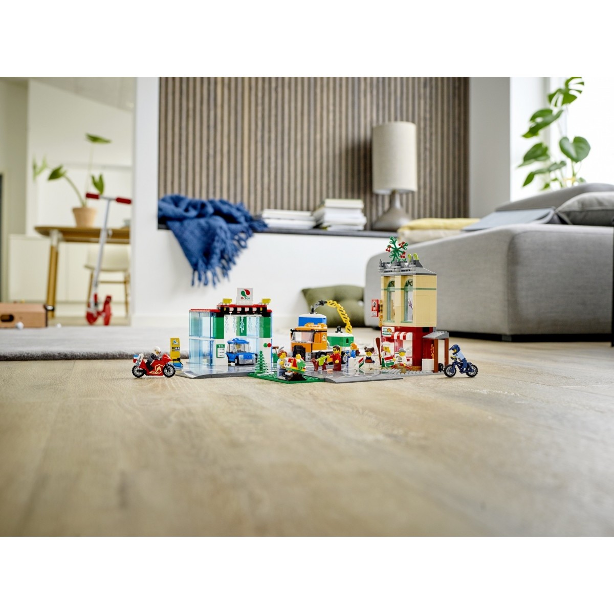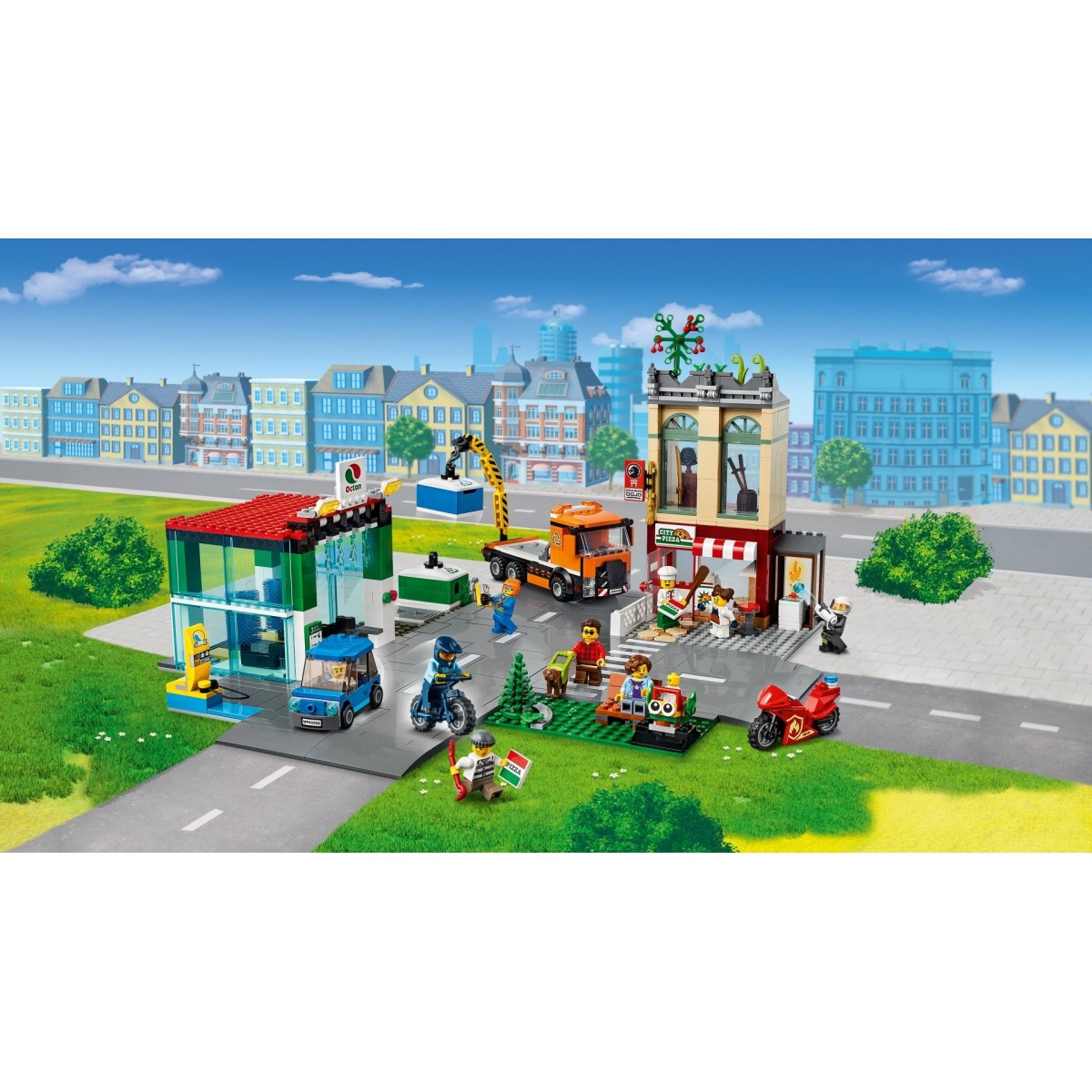 Il Centro città LEGO® City è un alveare di attività! Shirley Keeper è arrivata con il suo camion per ritirare i container della raccolta differenziata, la polizia insegue un ladro e un pompiere sta cercando di domare le fiamme nella pizzeria. Scopri tutti i servizi disponibili: l’autolavaggio, la stazione di ricarica per veicoli elettrici e un parco giochi con una giostra. E come se non bastasse, c’è anche un dojo per le arti marziali!
