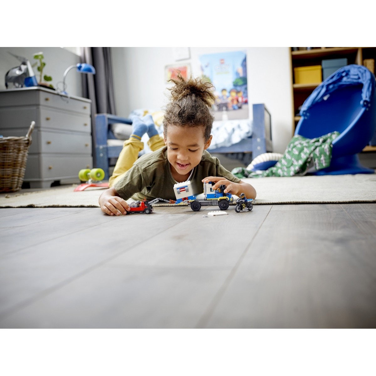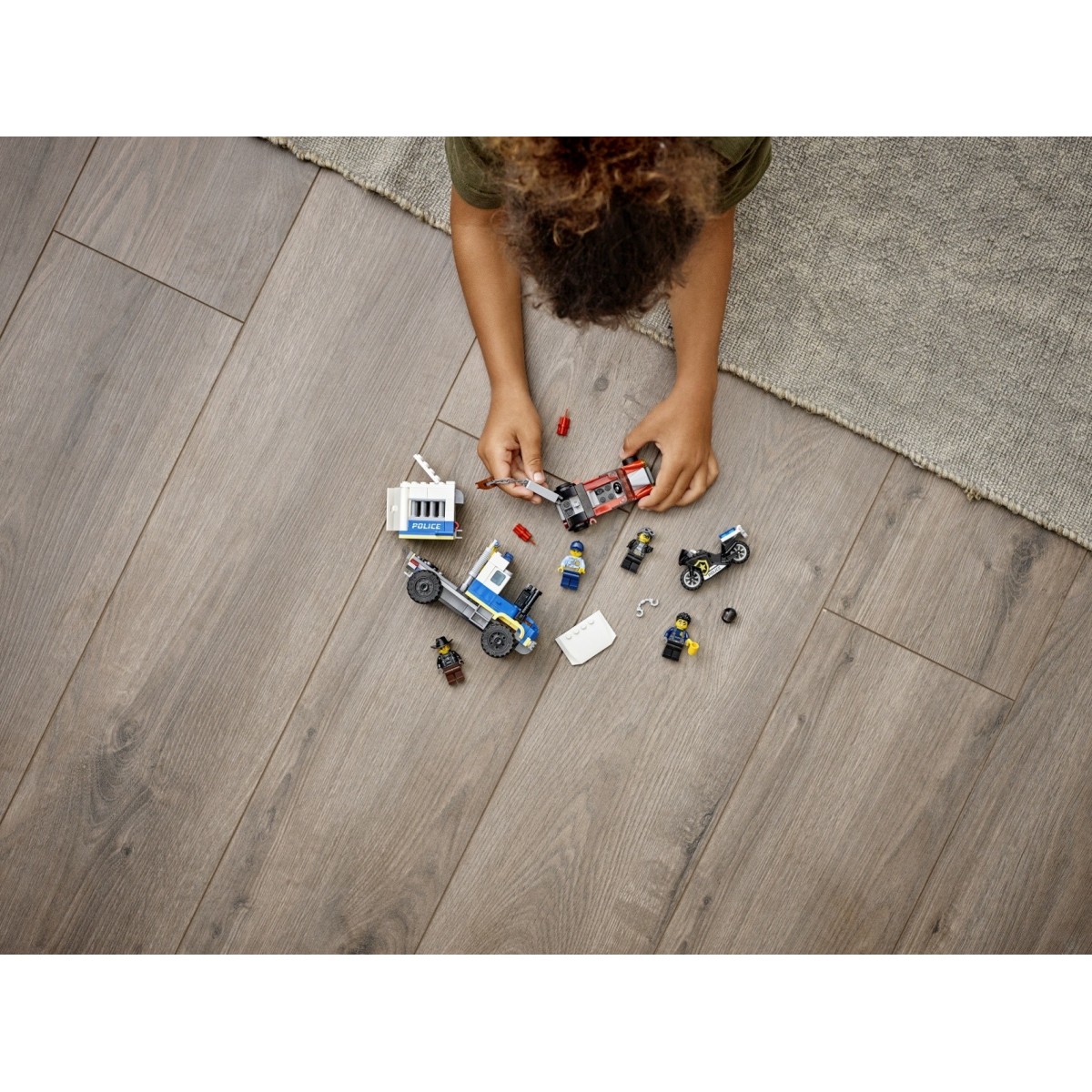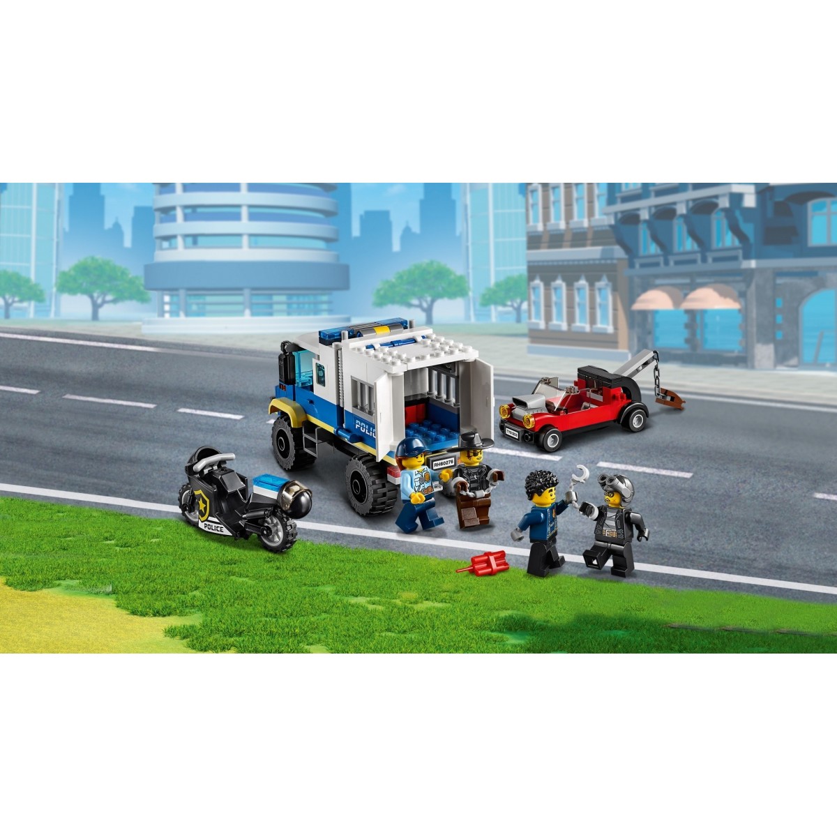La polizia di LEGO® City sta trasferendo il famigerato ladro Snake Rattler sull’iconico trasporto dei prigionieri della polizia, quando… BOOM! Un’esplosione libera la cella dal veicolo e Clara la Criminale la trascina via a tutta velocità sulla sua autogrù truccata con gancio di traino. Chiama l'eroe della polizia Duke DeTain che, a bordo della sua fantastica moto nera, riuscirà a intercettare i ladri prima che si dileguino!