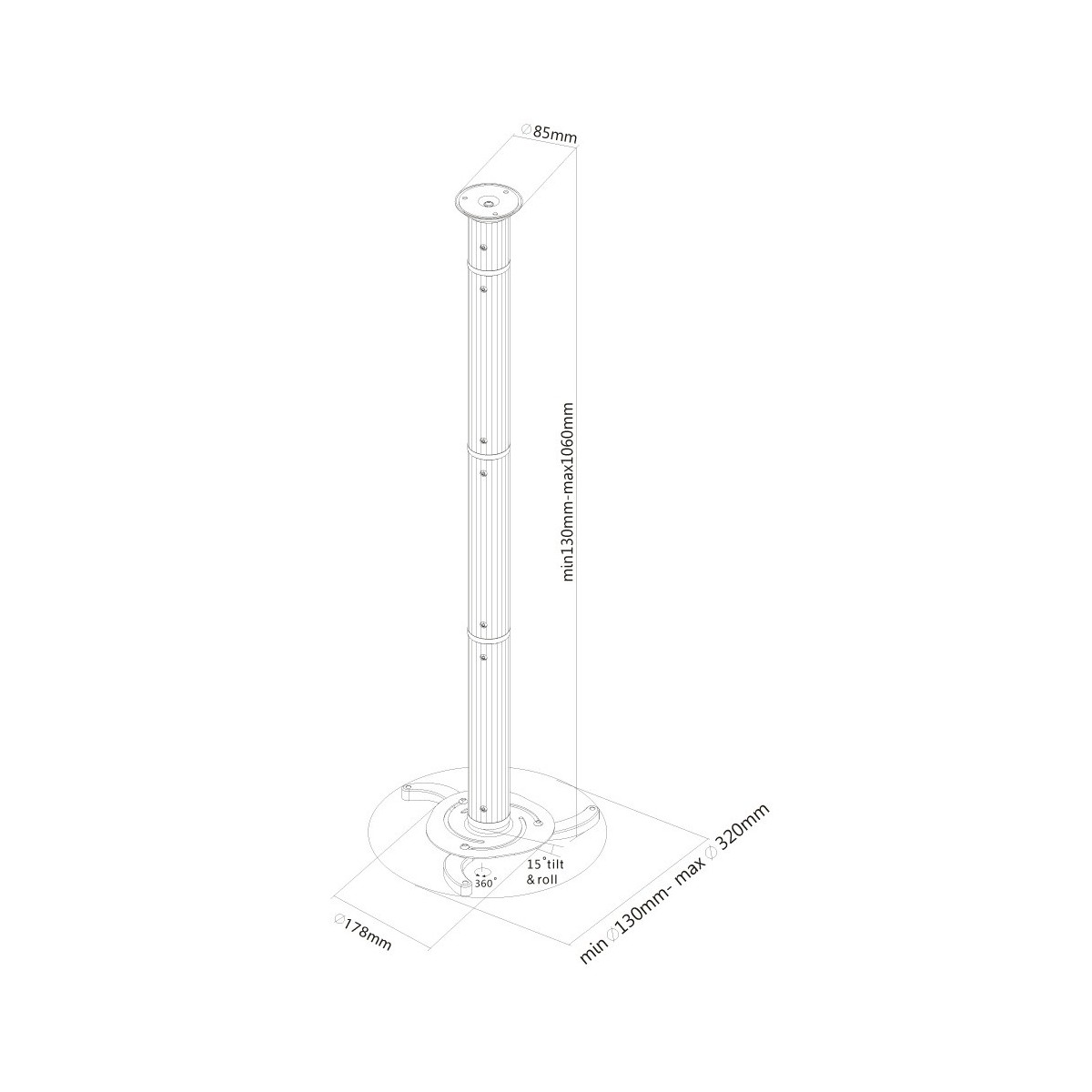 Newstar Supporto da soffitto per proiettori. Tipo di montaggio: Soffitto, Peso massimo (capacità): 15 kg, Colore del prodotto: Argento. Altezza: 1060 mm, Larghezza imballo: 370 mm, Profondità imballo: 70 mm. Paese di origine: Cina. Quantità per cartone principale: 6 pezzo(i), Peso netto del cartone principale: 14,2 kg, Codice del Sistema Armonizzato (SA): HS83025000. Peso netto del pacco: 2,4 kg