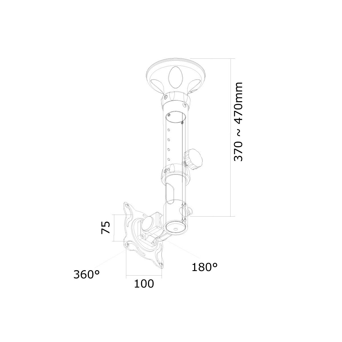 Newstar Supporto da soffitto per schermi LCD/LED/TFT. Peso massimo (capacità): 12 kg, Capienza minima dimensioni dello schermo: 25,4 cm (10"), Capienza massima dimensioni dello schermo: 76,2 cm (30"), Compatibilità interfaccia di montaggio (min): 75 x 75 mm, Compatibilità interfaccia di montaggio (max): 100 x 100 mm. Range di regolazione altezza: 370 - 470 mm, Inclinazione: 0 - 180°. Colore del prodotto: Nero