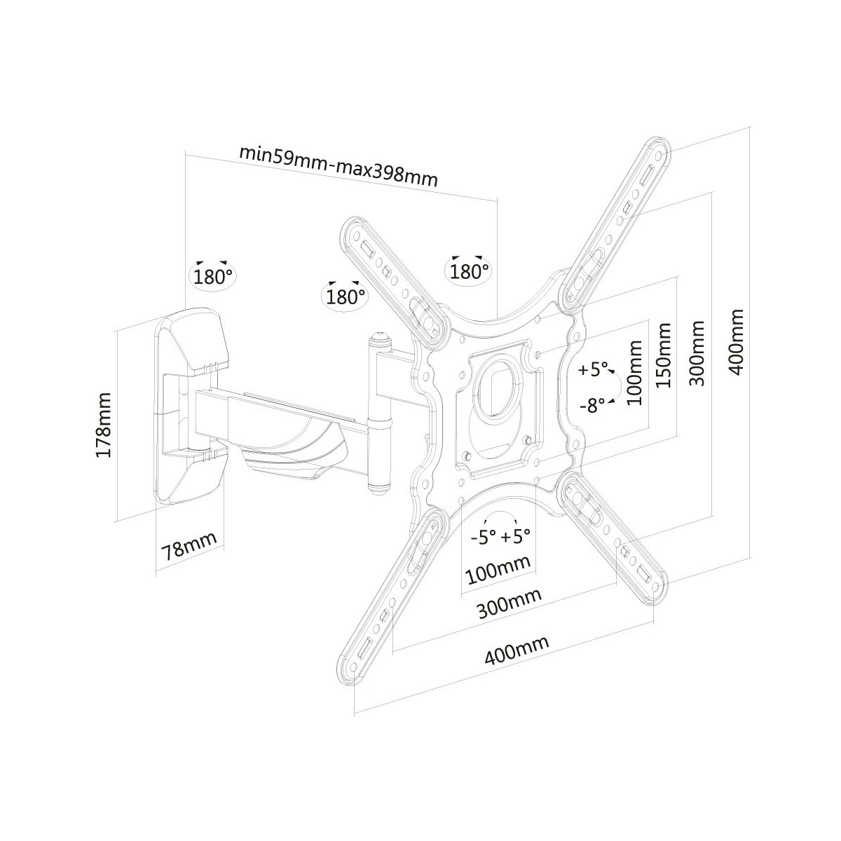 Il LED-W430BLACK ha tre punti di articolazione ed è adatto a schermi fino a 55" con una capacità massima di trasporto di 30 kg. Questo prodotto è adatto per schermi con fori VESA da 100x100 fino a 400x400 mm.