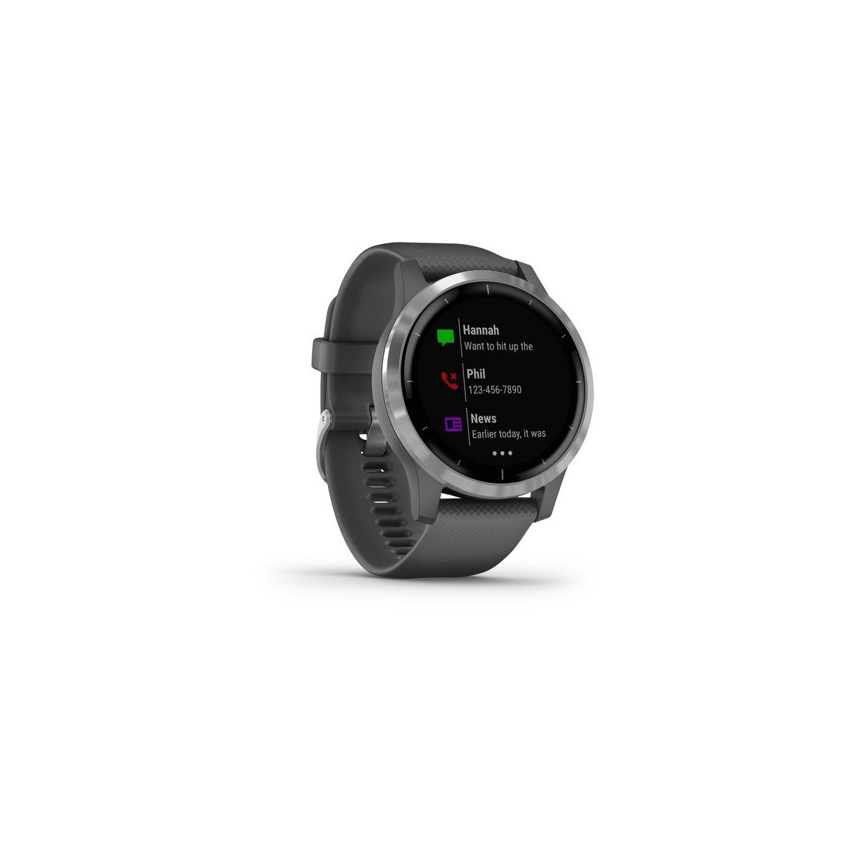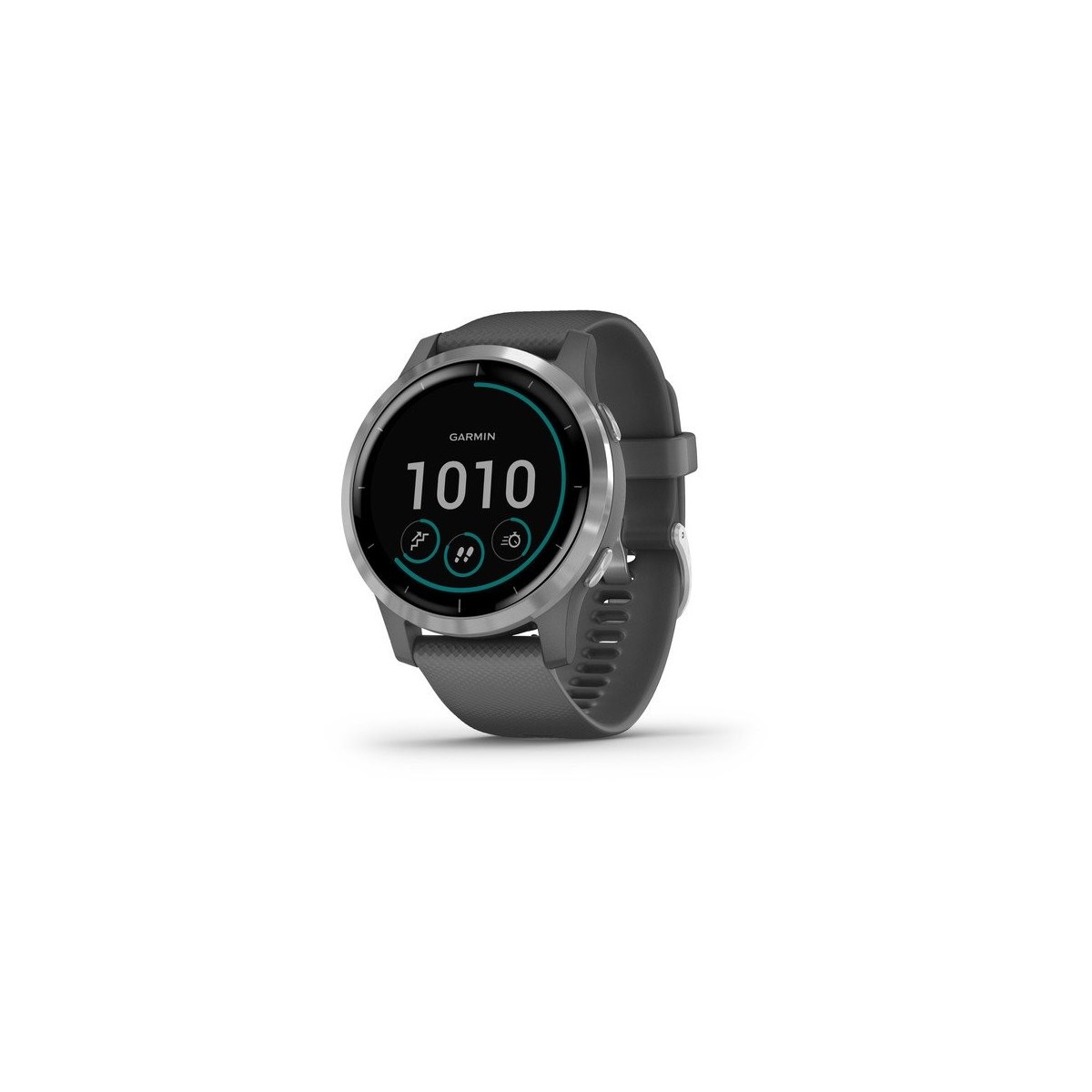 Garmin vívoactive 4. Dimensioni schermo: 3,3 cm (1.3"), Risoluzione del display: 260 x 260 Pixel, Touch screen. Wi-Fi. GPS (satellitare). Peso: 50,5 g. Materiale della scocca: Acciaio inossidabile, Colore struttura: Argento, Materiale cinturino: Silicone, Colore cinturino: Grigio