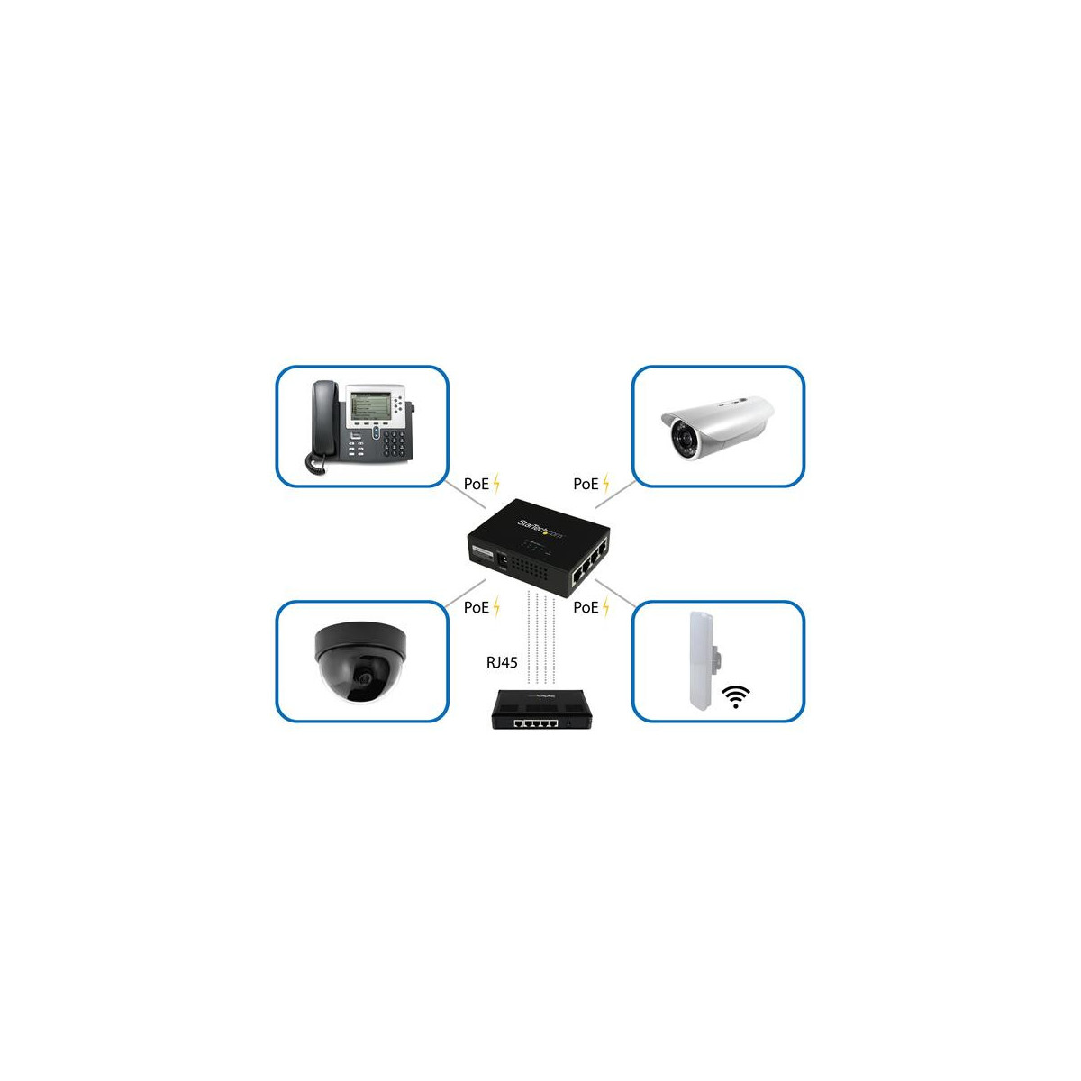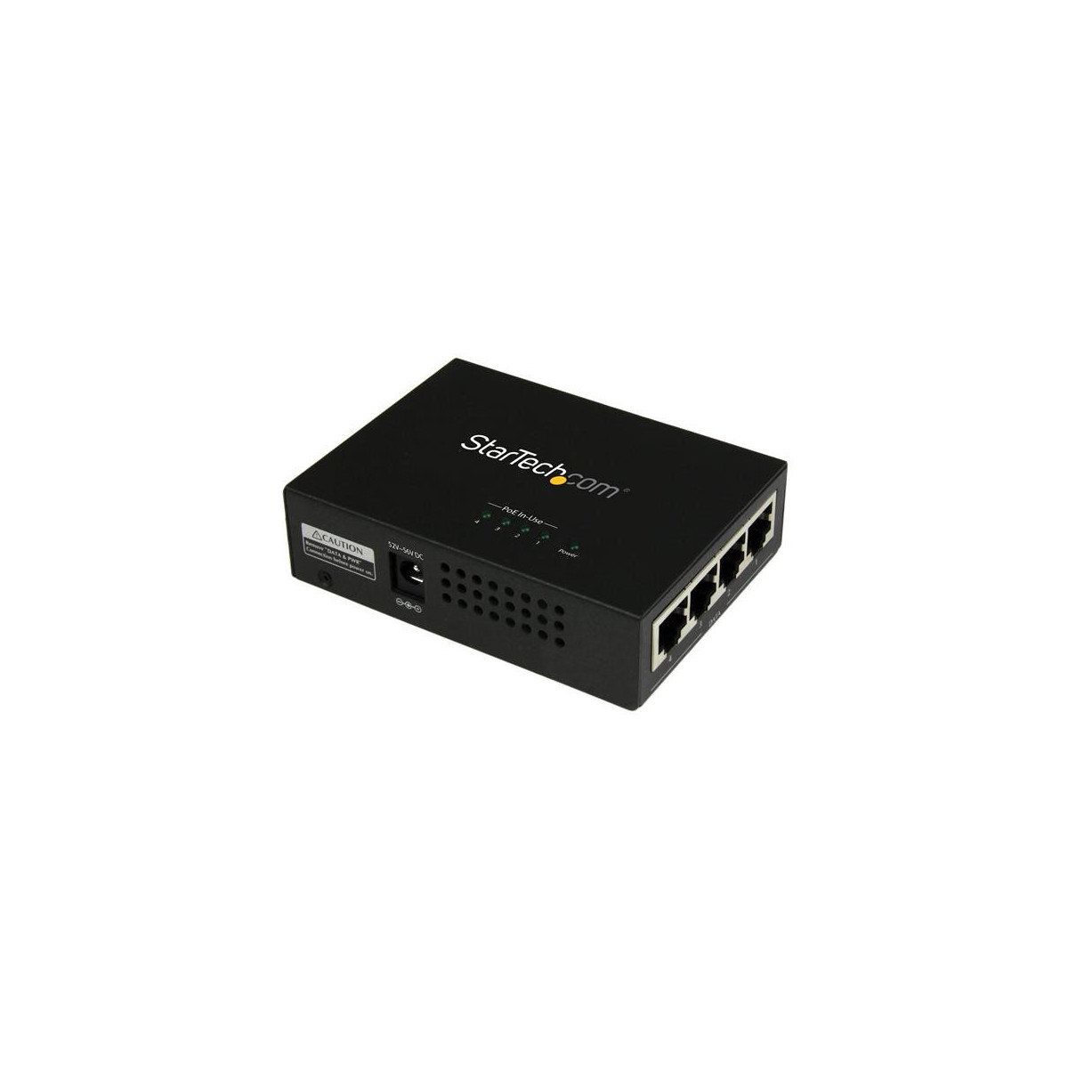StarTech.com Iniettore midspan Gigabit Power over Ethernet (PoE) a 4 porte - 802.3at/af. Tipo: Trasmettitore di rete, Distanza massima di trasferimento: 100 m, Velocità di trasferimento dati: 2000 Mbit/s. Tecnologia di cablaggio: 10/100/1000Base-T(X), Standard di rete: IEEE 802.3,IEEE 802.3ab,IEEE 802.3af,IEEE 802.3at,IEEE 802.3u. Colore del prodotto: Nero, Materiale della scocca: Acciaio, Indicatori LED: PoE, Potenza. Tensione di ingresso AC: 100-240 V, Consumo energetico (max): 120 W, Voltaggio di uscita: 52 V. Larghezza: 70 mm, Profondità: 94 mm, Altezza: 26 mm