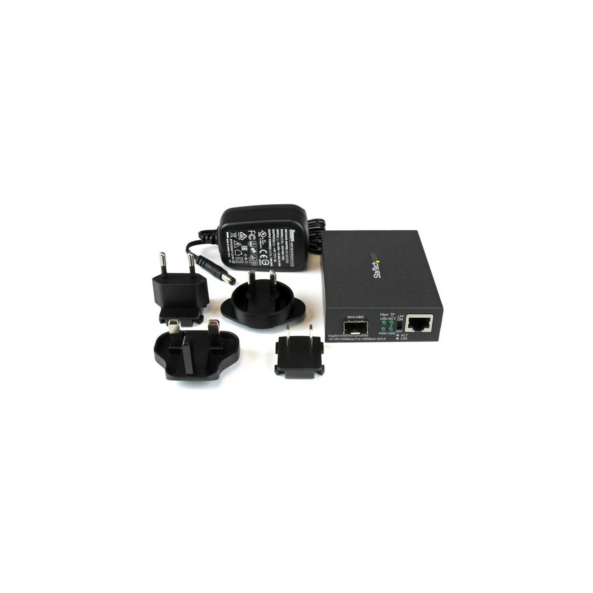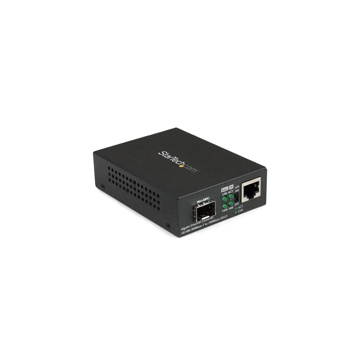 StarTech.com Convertitore multimediale Gigabit Ethernet a Fibra con slot SFP aperto 10/100/1000. Velocità massima di trasferimento dati: 1000 Mbit/s, interfaccia convertitore input: 1000Base-T,100Base-TX,10Base-T, interfaccia convertitore output: 1000Base-LX,1000Base-SX. Connettore a fibra ottica: SFP, Tecnologia di connessione: Cablato. Struttura della modalità di fibra: Modalità multipla, Modalità singola, Tempo medio tra guasti (MTBF): 50000 h. Indicatori LED: Attività, Collegamento, Potenza, Colore del prodotto: Nero, Materiale della scocca: Acciaio. Voltaggio di ingresso: 100 - 240 V, Corrente d'ingresso: 1 A, Voltaggio di uscita: 5 V