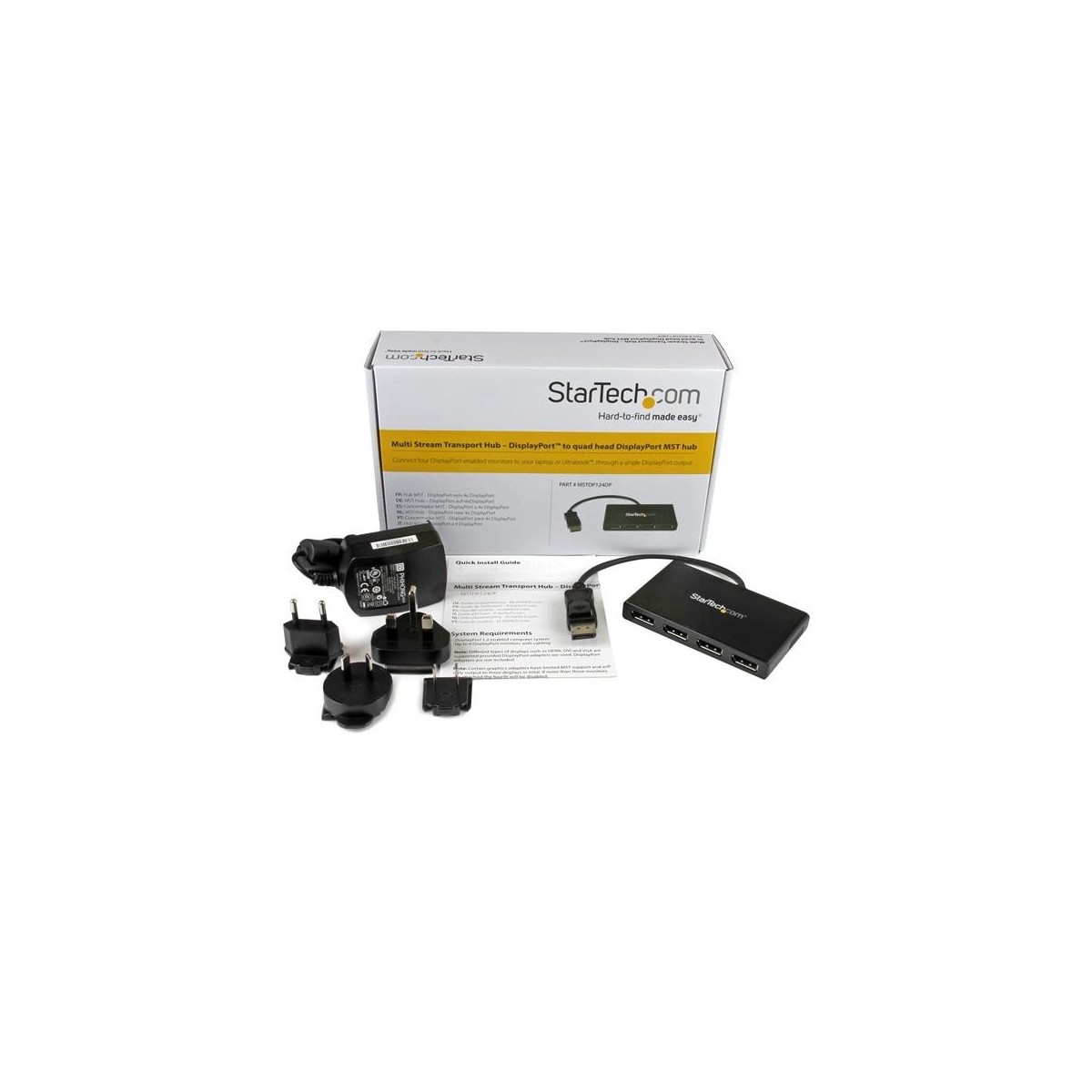 StarTech.com Adattatore Splitter MST Hub - DisplayPort a 4 porte DisplayPort. Tipo porta video: DisplayPort, Uscita video: 4x DisplayPort. Risoluzione massima: 3840 x 2160 Pixel, Colore del prodotto: Nero, Materiale della scocca: Plastica. Voltaggio di ingresso: 110 - 240 V, Corrente d'ingresso: 0.5 A, Voltaggio di uscita: 5 V. Larghezza: 65 mm, Profondità: 386 mm, Altezza: 15 mm. Larghezza imballo: 241 mm, Profondità imballo: 152 mm, Altezza imballo: 64 mm