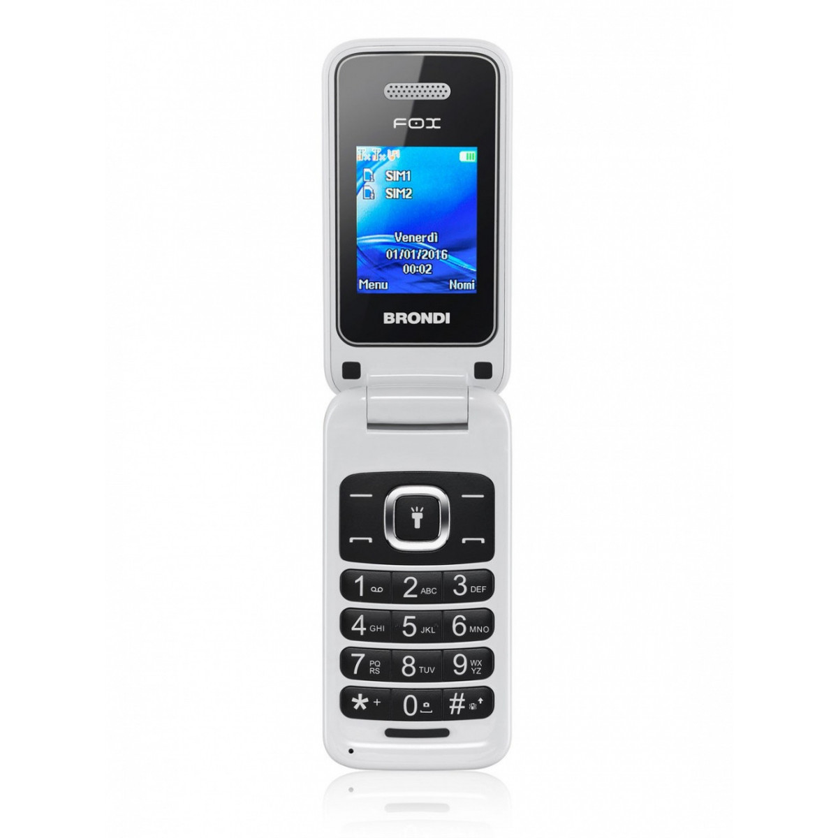 Brondi Fox. Fattore di forma: A conchiglia. Capacità della scheda SIM: Doppia SIM. Dimensioni schermo: 4,5 cm (1.77"), Risoluzione del display: 128 x 160 Pixel. Risoluzione fotocamera posteriore (numerico): 1,3 MP. Bluetooth. Radio FM. Capacità della batteria: 600 mAh, Autonomia in standby (2G): 150 h. Peso: 74 g. Colore del prodotto: Bianco