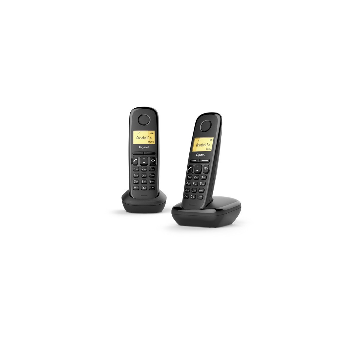 Gigaset A170 Duo. Tipo: Telefono analogico/DECT, Tipo di apparecchio: Cornetta wireless, Raggio d'azione interno: 50 m, Raggio d'azione esterno: 300 m. Capacità rubrica: 50 voci. Identificatore di chiamata. Dimensioni schermo: 3,81 cm (1.5"). Colore del prodotto: Nero. Numero di cornette incluse: 2