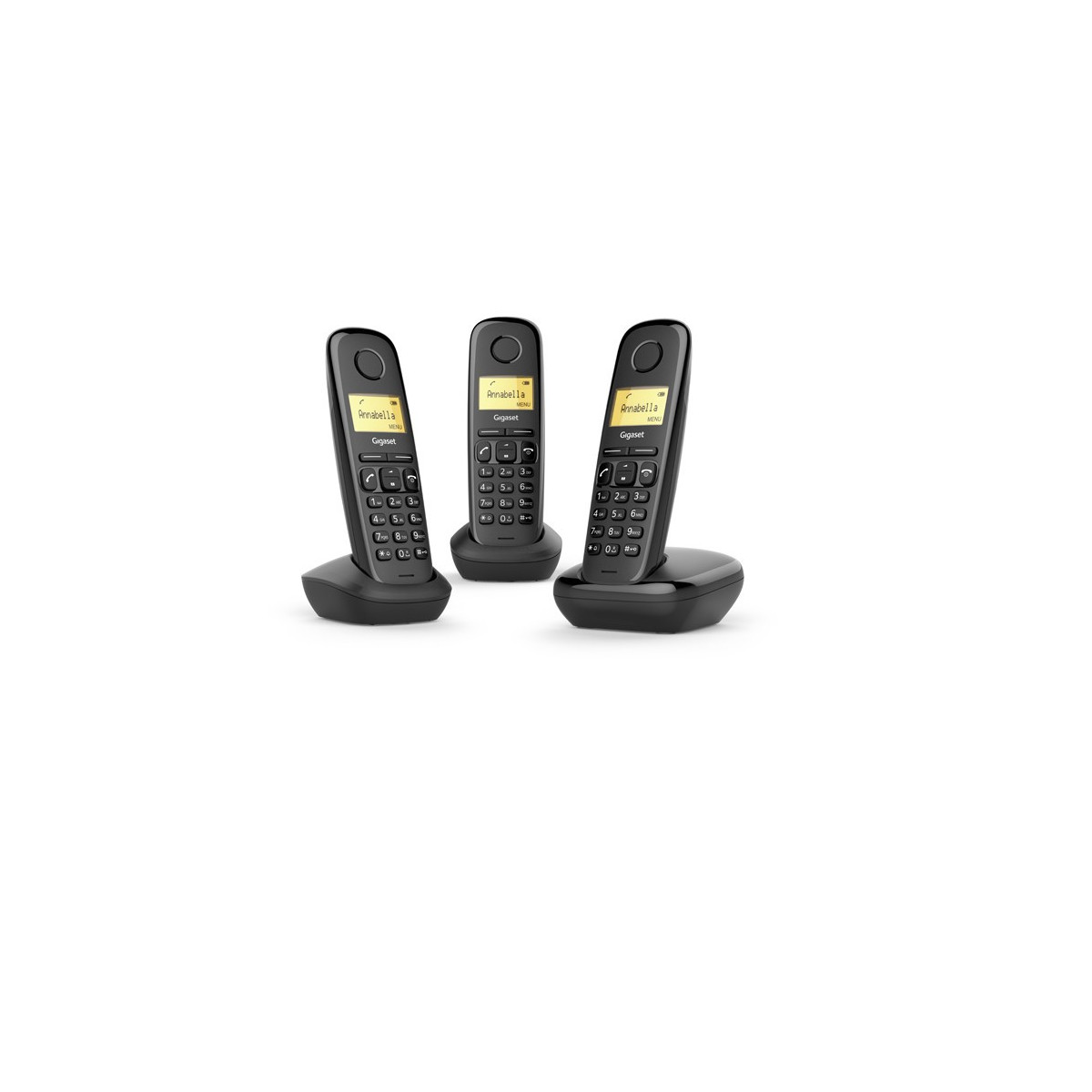 Gigaset A170 Trio. Tipo: Telefono analogico/DECT, Tipo di apparecchio: Cornetta wireless, Raggio d'azione interno: 50 m, Raggio d'azione esterno: 300 m. Capacità rubrica: 50 voci. Identificatore di chiamata. Dimensioni schermo: 3,81 cm (1.5"). Colore del prodotto: Nero. Numero di cornette incluse: 3