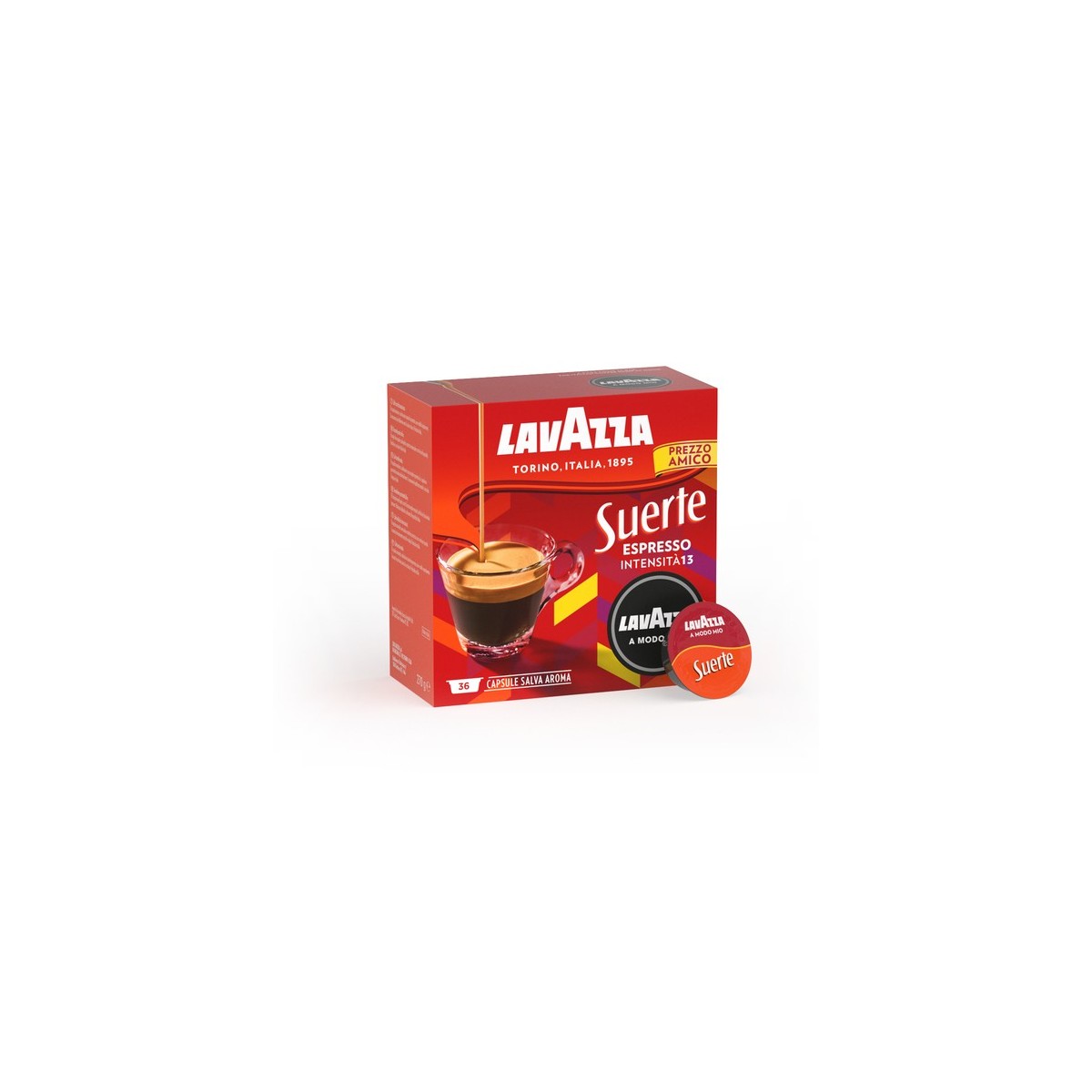 Lavazza Suerte. Tipo di prodotto: Capsule caffè, Tipologie di bevande: Espresso, Livello di tostatura del caffè: Tostatura scura. Peso: 7,5 g. Peso dell'imballo: 270 g, Tipo di imballo: Scatola. Quantità per pacco: 36 pezzo(i)