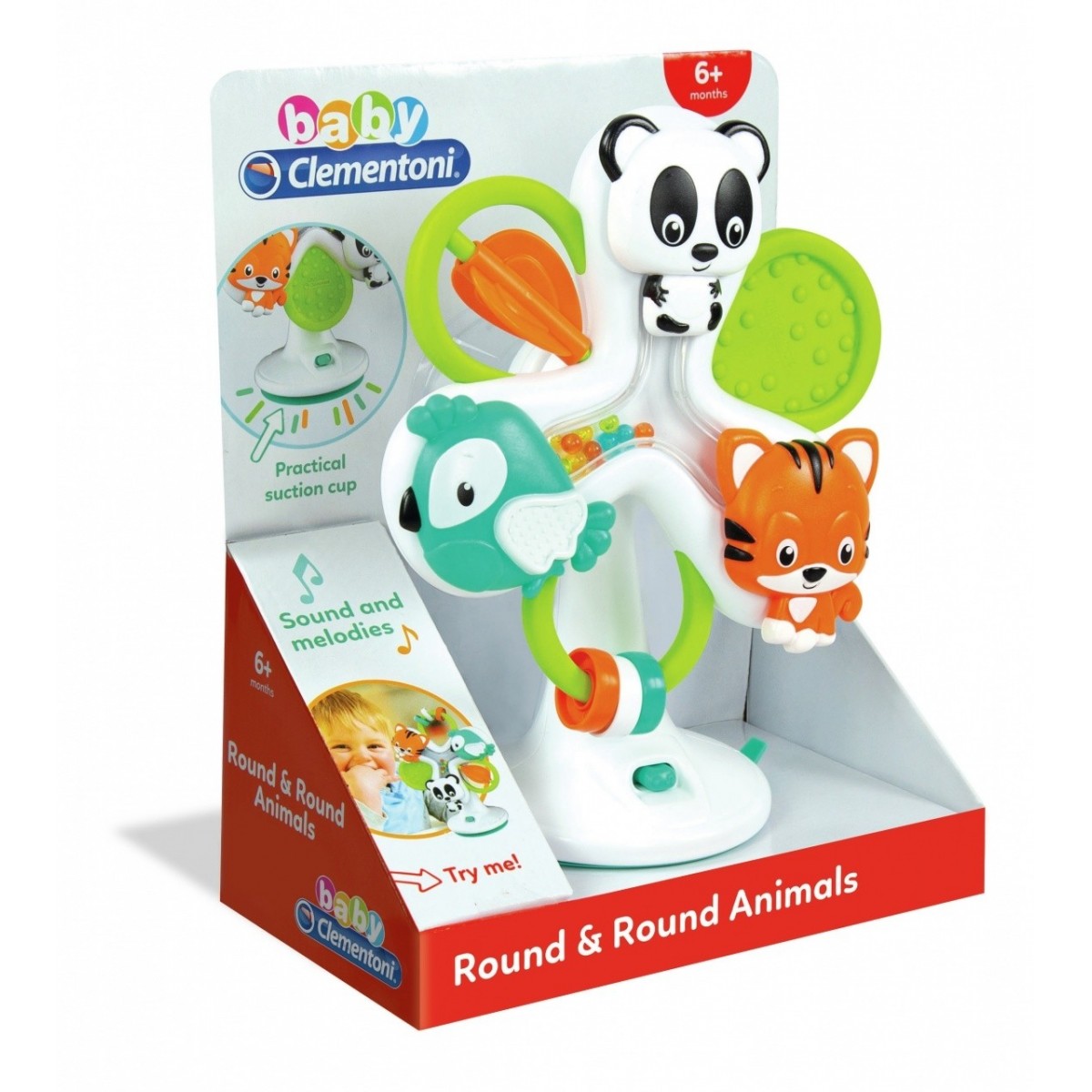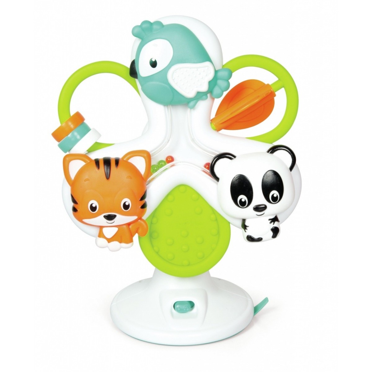 La ventosa sotto la base permette di fissare il gioco al piano del seggiolone in modo pratico e semplice.