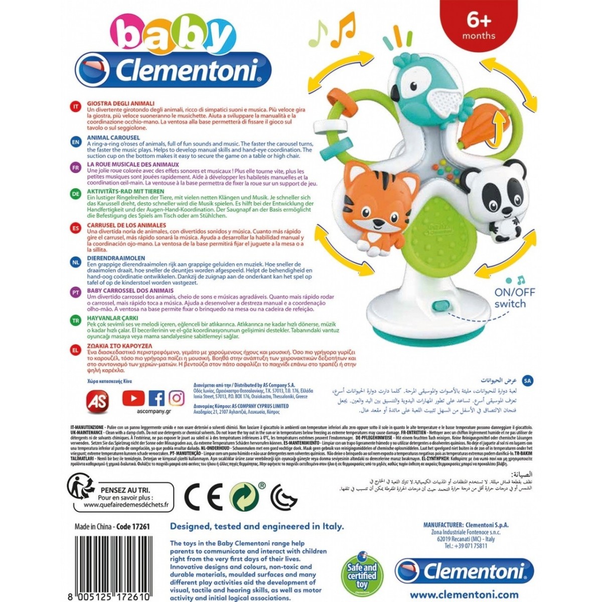 Clementoni Giostra degli Animali. Genere consigliato: Ragazzo/Ragazza, Età consigliata (min): 6 mese(i), Compatibile con: Seggiolone, Sonoro, Colore del prodotto: Multicolore. Quantità per pacco: 1 pezzo(i)