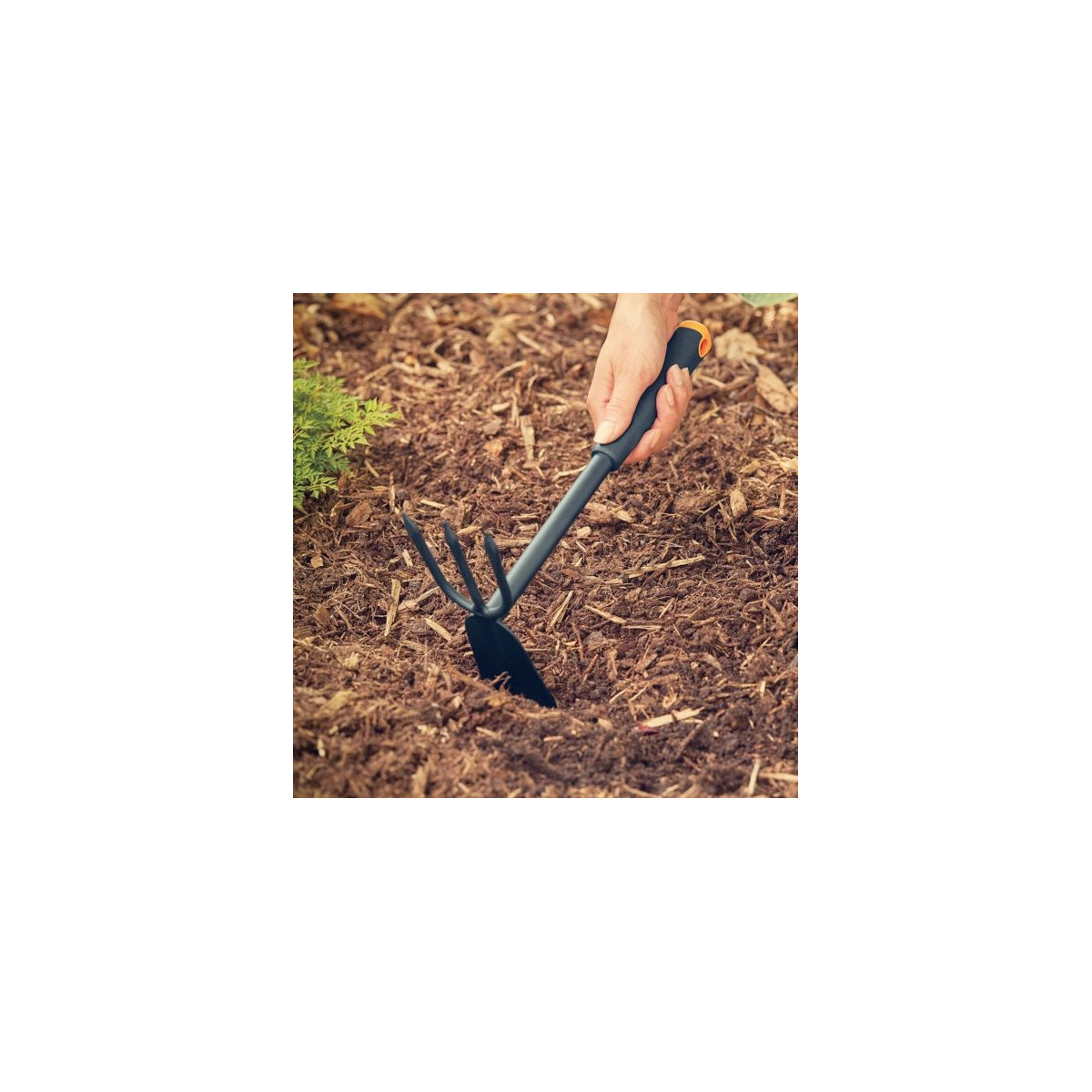 La Zappetta Ergo di Fiskars è un utile strumento due-in-uno per smuovere, areare e scavare il terreno. Il manico ergonomico permette un'impugnatura naturale e riduce così l'affaticamento. La testa in acciaio con rivestimento antiruggine garantisce la massima resistenza. Questo attrezzo presenta inoltre un foro nel manico, che permette di appenderlo e conservarlo facilmente.