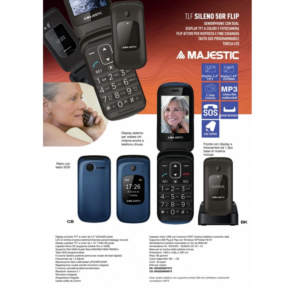 New Majestic Sileno 50R Flip. Fattore di forma: A conchiglia. Capacità della scheda SIM: SIM singola. Dimensioni schermo: 6,1 cm (2.4"), Risoluzione del display: 240 x 320 Pixel, Display esterno. Risoluzione fotocamera posteriore (numerico): 0,3 MP. Bluetooth. Radio FM. Tecnologia batteria: Litio, Capacità della batteria: 800 mAh. Peso: 90 g. Colore del prodotto: Nero