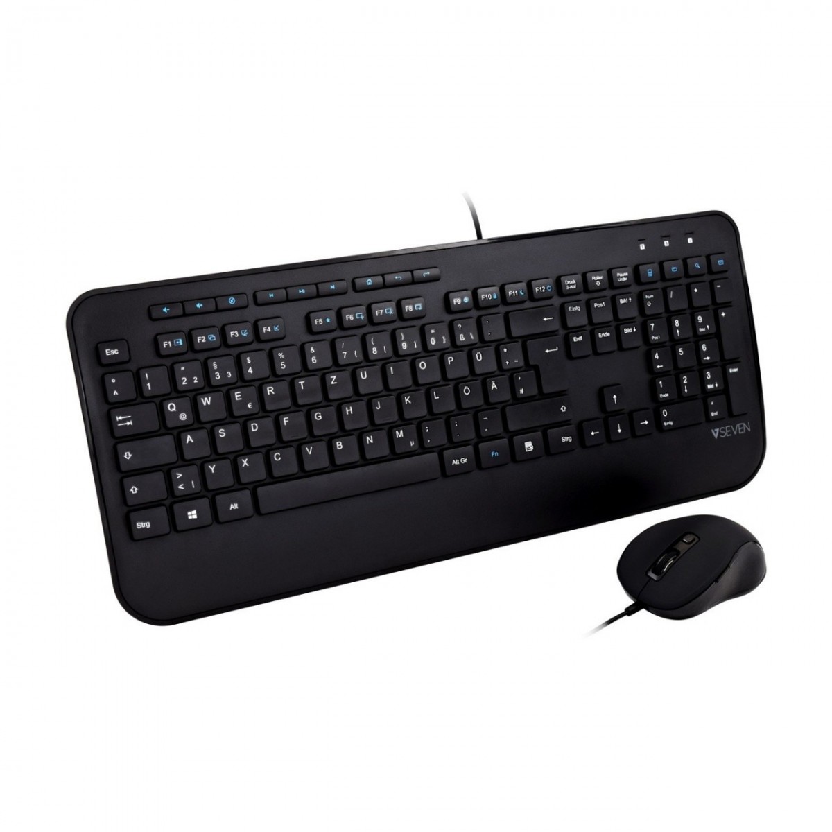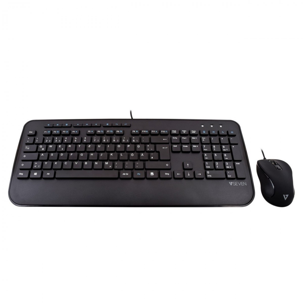 V7 Combinazione di tastiera USB di dimensioni standard con poggiapolsi e mouse ambidestro - DE. Fattore di forma tastiera: Standard. Stile tastiera: Dritto. Interfaccia dispositivo: USB, Interruttore a chiave per tastiera: Interruttore a chiave a membrana, Struttura tastiera: QWERTZ. Riposo del polso. Lunghezza cavo: 1,8 m. Utilizzo raccomandato: Casa. Colore del prodotto: Nero. Mouse incluso