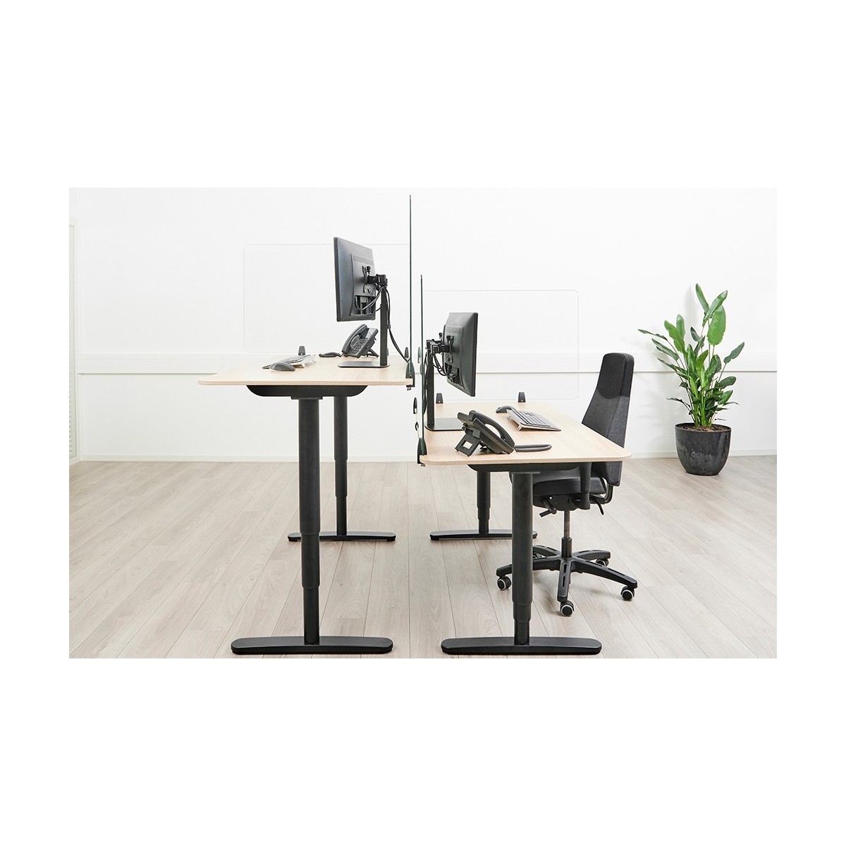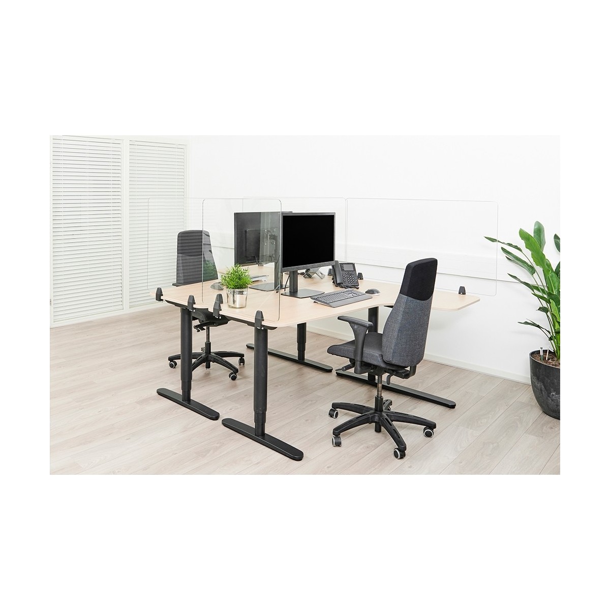 NS-GLSPROTECT120 ha una larghezza di 1,2 m x un'altezza di 65 cm ed è adatto per scrivanie con uno spessore massimo di 25 mm*. Lo schermo è realizzato in vetro stratificato e temperato di 6 mm e presenta angoli e bordi arrotondati per una maggiore sicurezza. Lo schermo può essere facilmente installato sulla scrivania con 2 morsetti e offre una soluzione durevole ed elegante per il nuovo modo di lavorare. Lo schermo è dotato di serie di morsetti bianchi e neri. I morsetti garantiscono un'installazione solida e sicura sulla scrivania e si spostano senza problemi con la postazione di lavoro quando viene regolata in altezza.