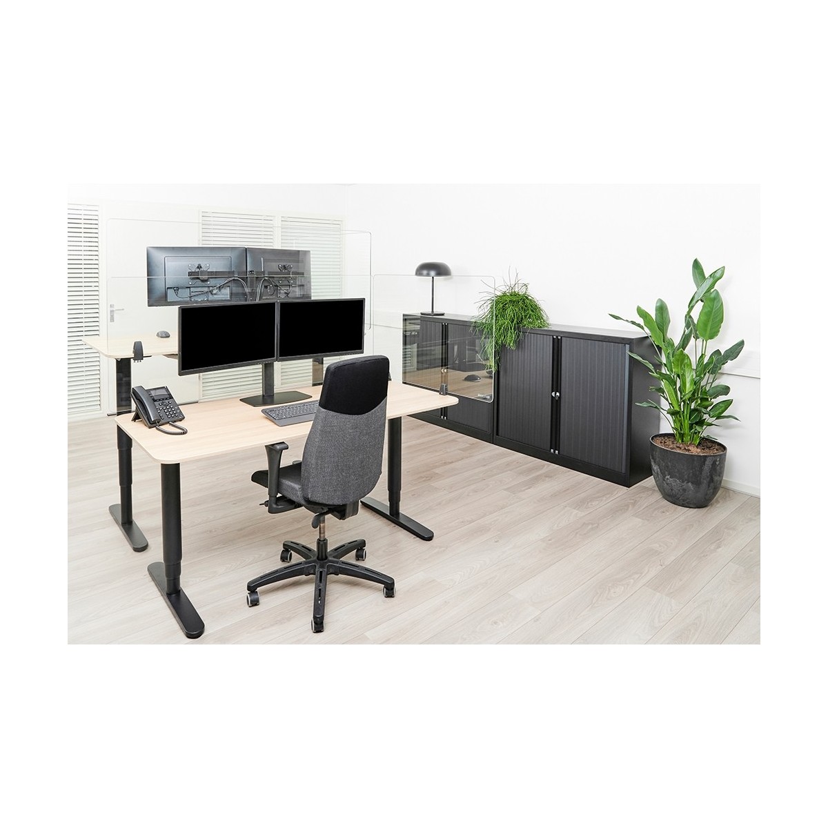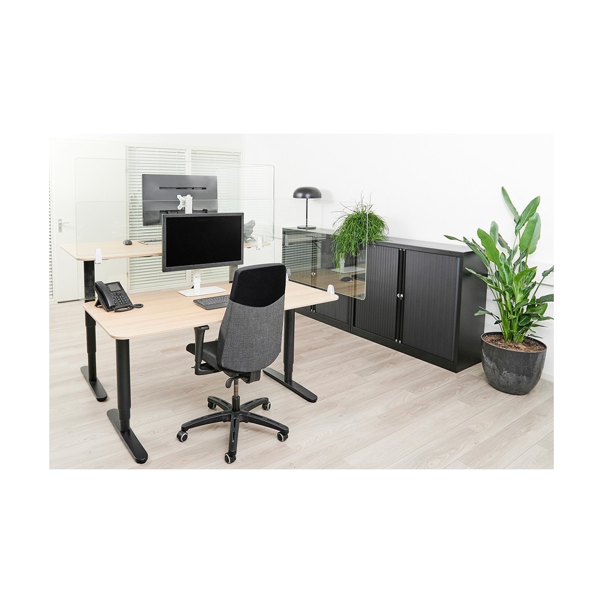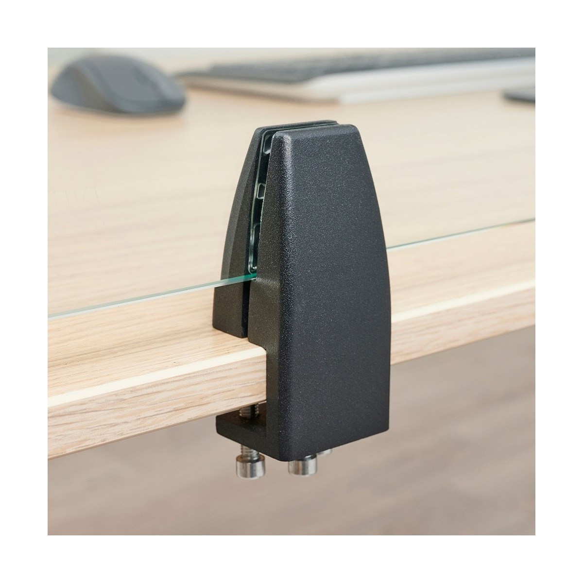 NS-GLSPROTECT160 ha una larghezza di 1,58 m x un'altezza di 65 cm ed è adatto per scrivanie con uno spessore massimo di 25 mm*. Lo schermo è realizzato in vetro stratificato e temperato di 6 mm e presenta angoli e bordi arrotondati per una maggiore sicurezza. Lo schermo può essere facilmente installato sulla scrivania con 2 morsetti e offre una soluzione durevole ed elegante per il nuovo modo di lavorare. Lo schermo è dotato di serie di morsetti bianchi e neri. I morsetti garantiscono un'installazione solida e sicura sulla scrivania e si spostano senza problemi con la postazione di lavoro quando viene regolata in altezza.