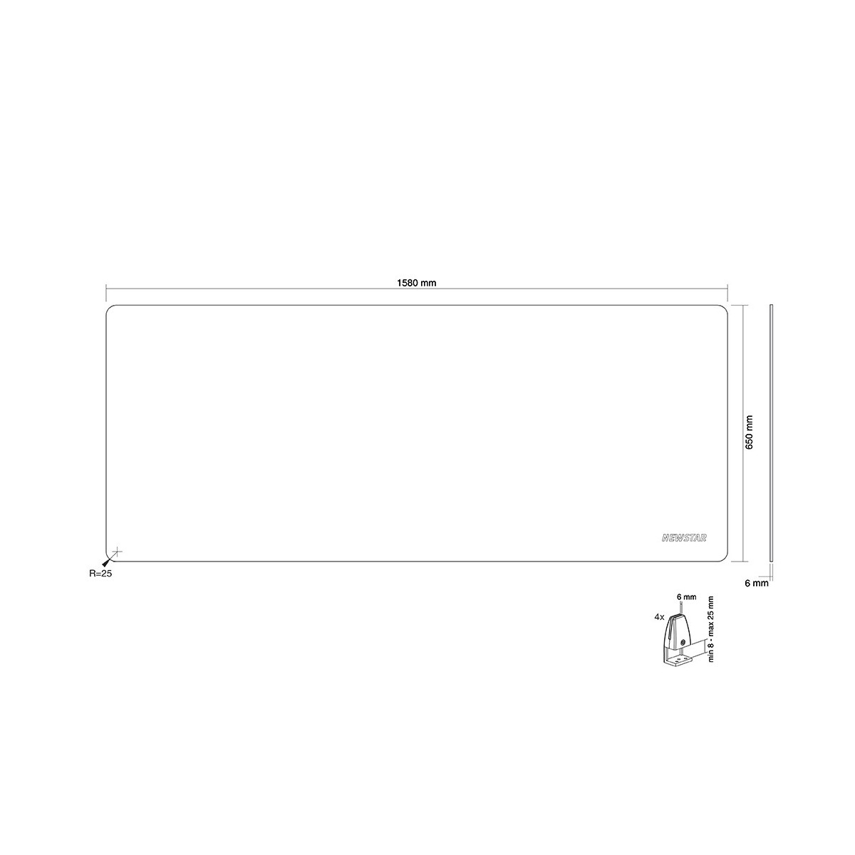 Newstar Schermo trasparente. Colore del prodotto: Trasparente, Quantità per pacco: 1 pezzo(i), Orientamento: Landscape. Spessore: 6 mm, Larghezza: 1580 mm, Altezza: 65 mm. Codice del Sistema Armonizzato (SA): HS83025000, Paese di origine: Paesi Bassi, Quantità per cartone principale: 1 pezzo(i)
