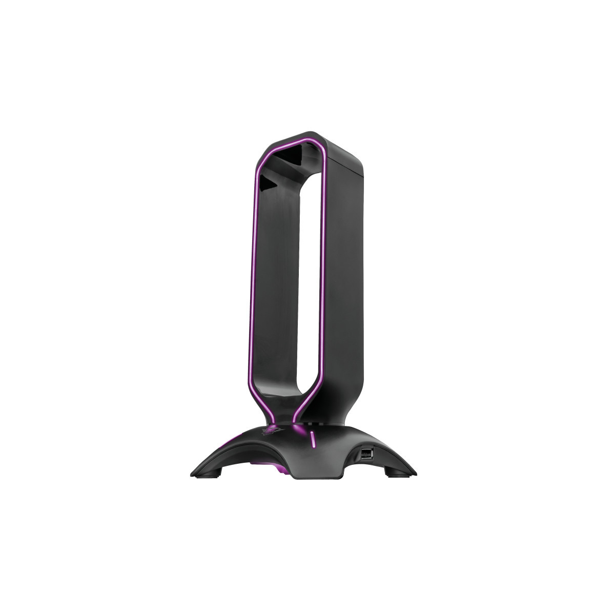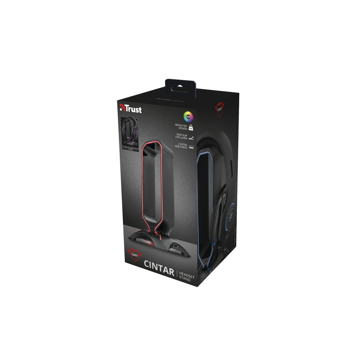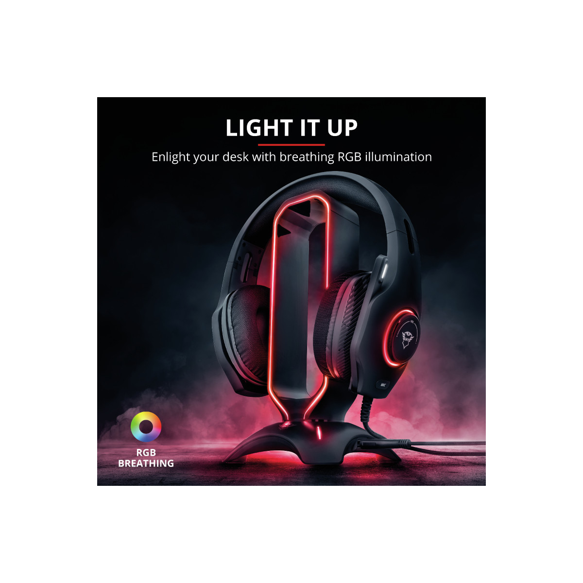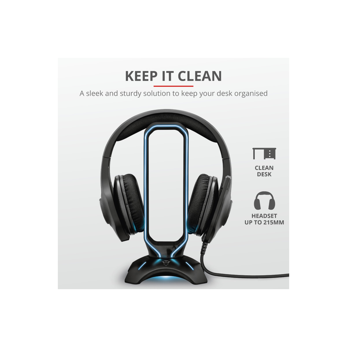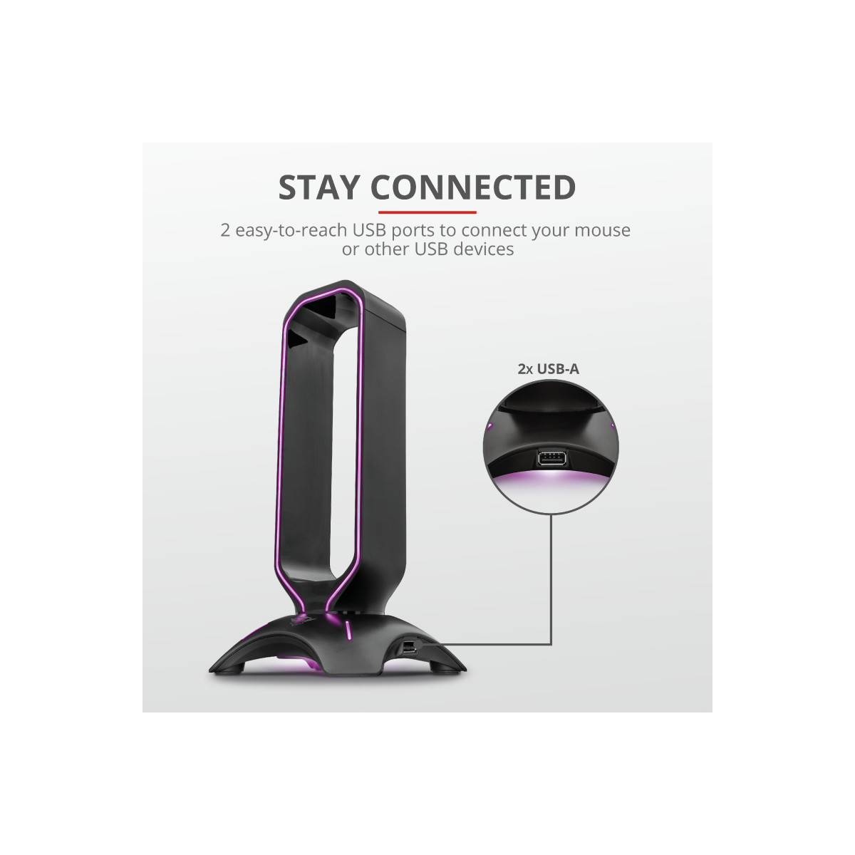 Tieni in ordine la scrivania con il supporto per cuffie Trust GXT 265 Cintar RGB. Quest'elegante accessorio non si limita a sostenere le tue cuffie: ha due porte USB facilmente raggiungibili e aggiunge alla tua postazione di gaming delle straordinarie luci RGB.