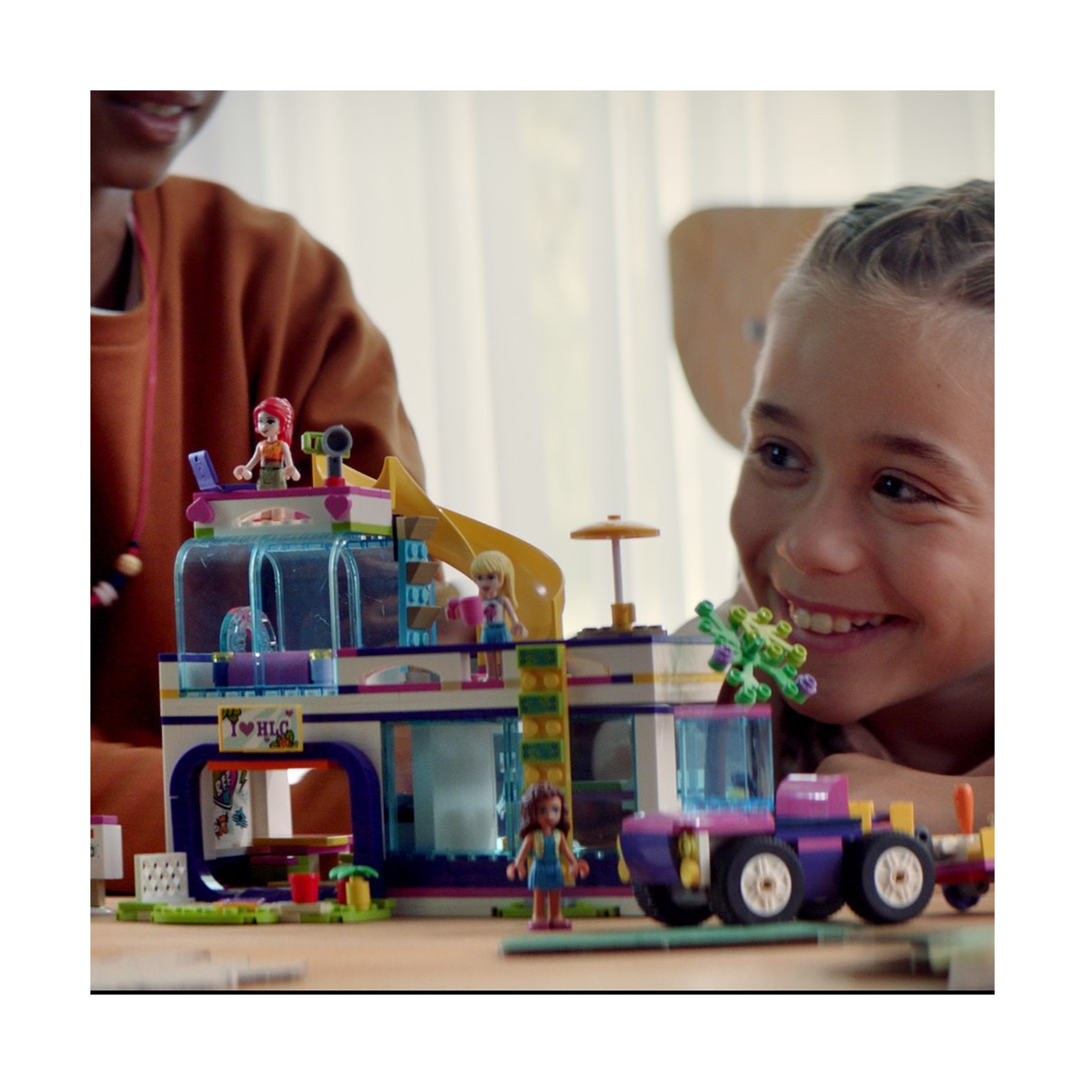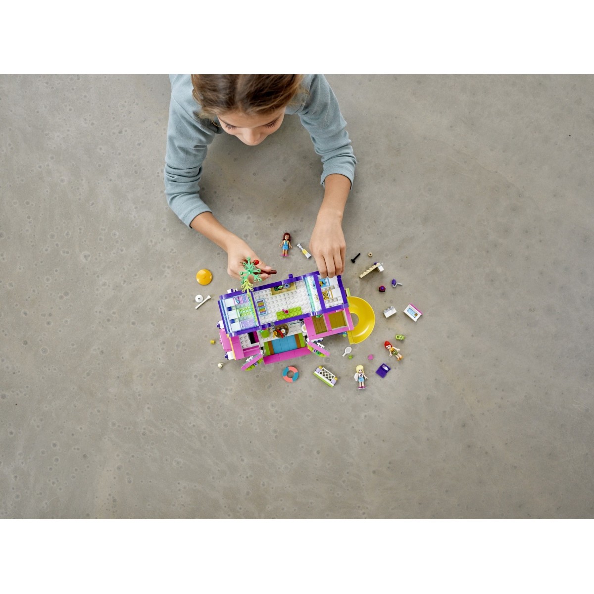 Allaccia la cintura per un’avventura senza fine sul Bus dell’amicizia. Unisciti alle tue migliori amiche mentre si rilassano sul loro autobus, dotato di piscina estraibile e di super scivolo! Scorri all’indietro la parte superiore per raggiungere il bagno, la cucina e la sala da pranzo. Aiuta le ragazze a salire sul piano superiore e a metterle a letto: possono vedere le stelle mentre si riposano sotto il tetto trasparente.