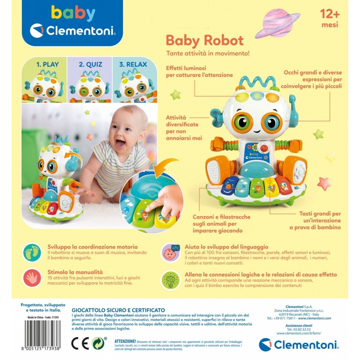 Clementoni Robi Robo'. Tipo di prodotto: Giocattolo musicale, Genere consigliato: Ragazzo/Ragazza, Età consigliata (min): 1 anno/i, Età consigliata (max): 3 anno/i. Tipo batteria: Stilo AA. Colore del prodotto: Multicolore