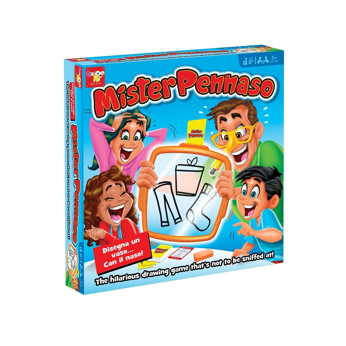 Mister Pennaso è il gioco esilarante che susciterà risate contagiose a tutta la famiglia! Saprai disegnare un vaso con il naso? E un’alice? Un astronauta? Ma soprattutto, sarai così bravo da far capire ai tuoi compagni di squadra che cosa stai disegnando? Porta la tua squadra alla vittoria creando disegni quanto più chiari e accurati possibile... Ma senza usare le mani! I giocatori si dividono in due squadre. A turno, ogni giocatore indossa gli speciali occhiali in dotazione, posiziona il pennarello sulla punta del naso e pesca una carta.